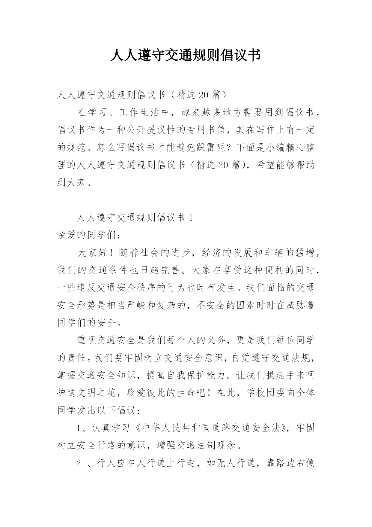 人人遵守交通规则倡议书人人遵守交通规则倡议书(精选20篇)在学习、工作生活中,越来越多地方需要用到倡议书,倡议书作为一种公开提议性的专用书信,其在写作上有一定的规范。怎么写倡议书才能避免踩雷呢?下面是小编精心整理的人人遵守交通规则倡议书(精选20篇),希望能够帮助到大家。人人遵守交通规则倡议书1亲爱的同学们:大家好!随着社会的进步,经济的发展和车辆的猛增,我们的交通条件也日趋完善。大家在享受这种便利的同时,一些违反交通安全秩序的行为也时有发生。我们面临的交通安全形势是相当严峻和复杂的,不安全的因素时时在威