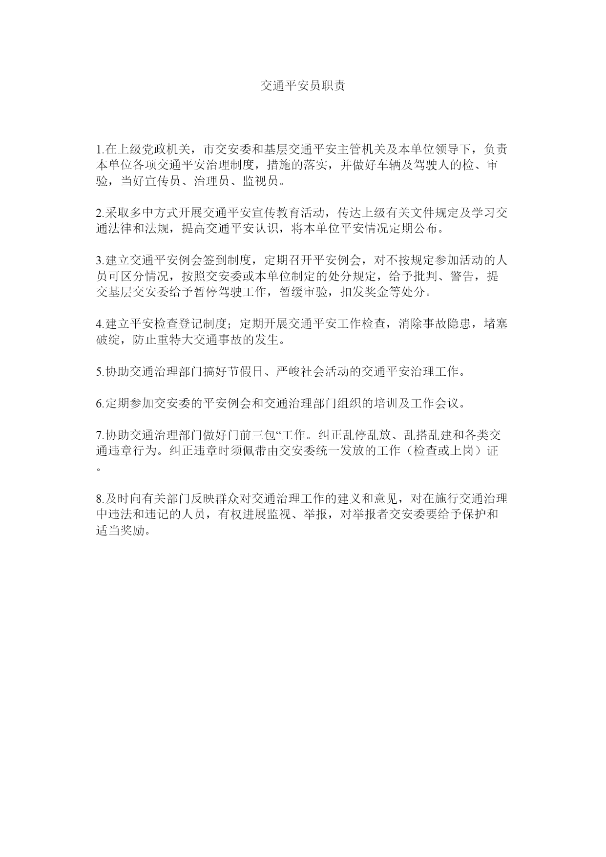 交通平安员职责1.在上级党政机关,市交安委和基层交通平安主管机关及本单位领导下,负责本单位各项交通平安治理制度,措施的落实,并做好车辆及驾驶人的检、审验,当好宣传员、治理员、监视员。2.采取多中方式开展交通平安宣传教育活动,传达上级有关文件规定及学习交通法律和法规,提高交通平安认识,将本单位平安情况定期公布。3.建立交通平安例会签到制度,定期召开平安例会,对不按规定参加活动的人员可区分情况,按照交安委或本单位制定的处分规定,给予批判、警告,提交基层交安委给予暂停驾驶工作,暂缓审验,扣发奖金等处分。4.建立