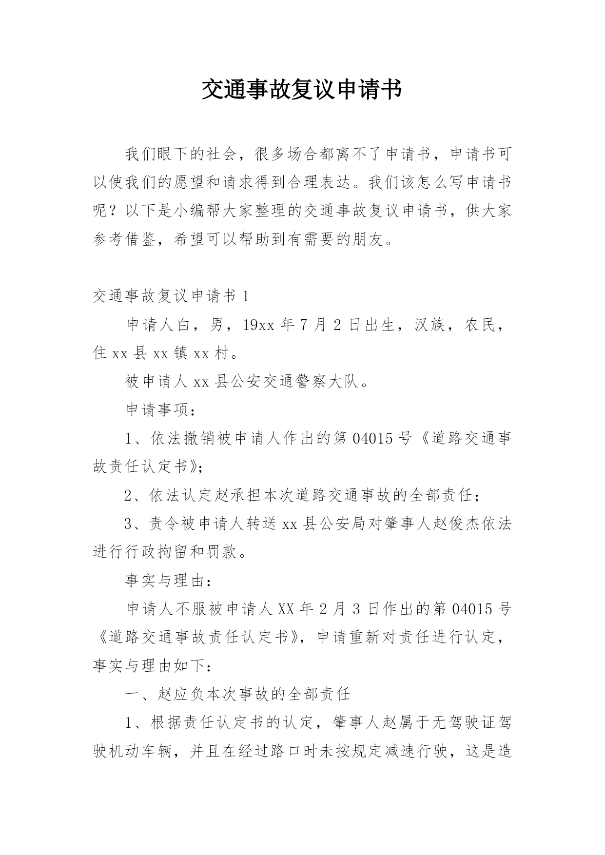 交通事故复议申请书我们眼下的社会,很多场合都离不了申请书,申请书可以使我们的愿望和请求得到合理表达。我们该怎么写申请书呢?以下是小编帮大家整理的交通事故复议申请书,供大家参考借鉴,希望可以帮助到有需要的朋友。交通事故复议申请书1申请人白,男,19xx年7月2日出生,汉族,农民,住xx县xx镇xx村。被申请人xx县公安交通警察大队。申请事项:1、依法撤销被申请人作出的第04015号《道路交通事故责任认定书》;2、依法认定赵承担本次道路交通事故的全部责任;3、责令被申请人转送xx县公安局对肇事人赵俊杰依法进行