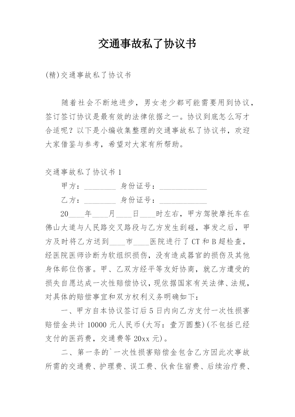 交通事故私了协议书(精)交通事故私了协议书随着社会不断地进步,男女老少都可能需要用到协议,签订签订协议是最有效的法律依据之一。协议到底怎么写才合适呢?以下是小编收集整理的交通事故私了协议书,欢迎大家借鉴与参考,希望对大家有所帮助。交通事故私了协议书1甲方:________身份证号:____________乙方:________身份证号:____________20____年____月____日____时左右,甲方驾驶摩托车在佛山大道与人民路交叉路段与乙方发生刮碰,事发之后,甲方及时将乙方送到____市__