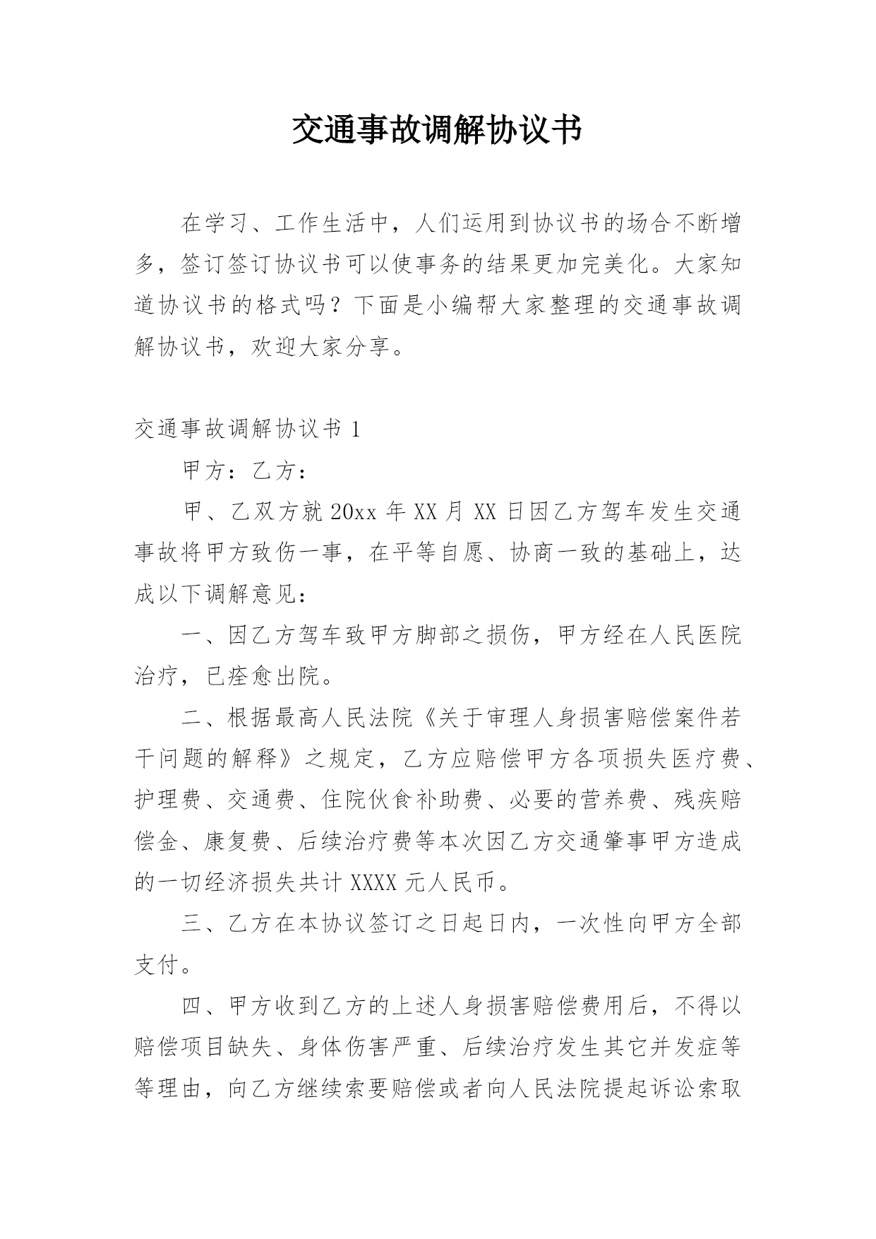 交通事故调解协议书在学习、工作生活中,人们运用到协议书的场合不断增多,签订签订协议书可以使事务的结果更加完美化。大家知道协议书的格式吗?下面是小编帮大家整理的交通事故调解协议书,欢迎大家分享。交通事故调解协议书1甲方:乙方:甲、乙双方就20xx年XX月XX日因乙方驾车发生交通事故将甲方致伤一事,在平等自愿、协商一致的基础上,达成以下调解意见:一、因乙方驾车致甲方脚部之损伤,甲方经在人民医院治疗,已痊愈出院。二、根据最高人民法院《关于审理人身损害赔偿案件若干问题的解释》之规定,乙方应赔偿甲方各项损失医疗费、