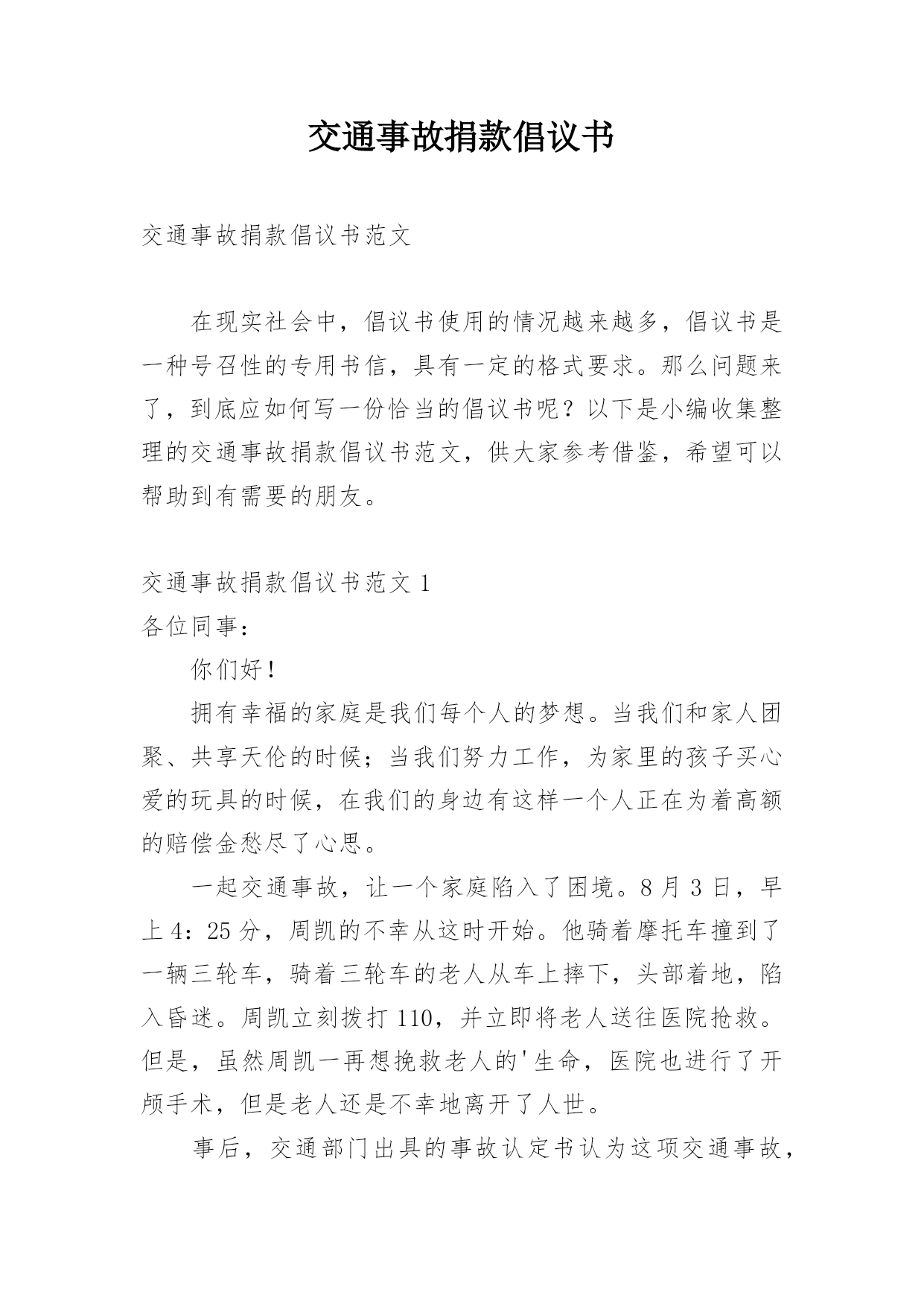 交通事故捐款倡议书交通事故捐款倡议书范文在现实社会中,倡议书使用的情况越来越多,倡议书是一种号召性的专用书信,具有一定的格式要求。那么问题来了,到底应如何写一份恰当的倡议书呢?以下是小编收集整理的交通事故捐款倡议书范文,供大家参考借鉴,希望可以帮助到有需要的朋友。交通事故捐款倡议书范文1各位同事:你们好!拥有幸福的家庭是我们每个人的梦想。当我们和家人团聚、共享天伦的时候;当我们努力工作,为家里的孩子买心爱的玩具的时候,在我们的身边有这样一个人正在为着高额的赔偿金愁尽了心思。一起交通事故,让一个家庭陷入了困