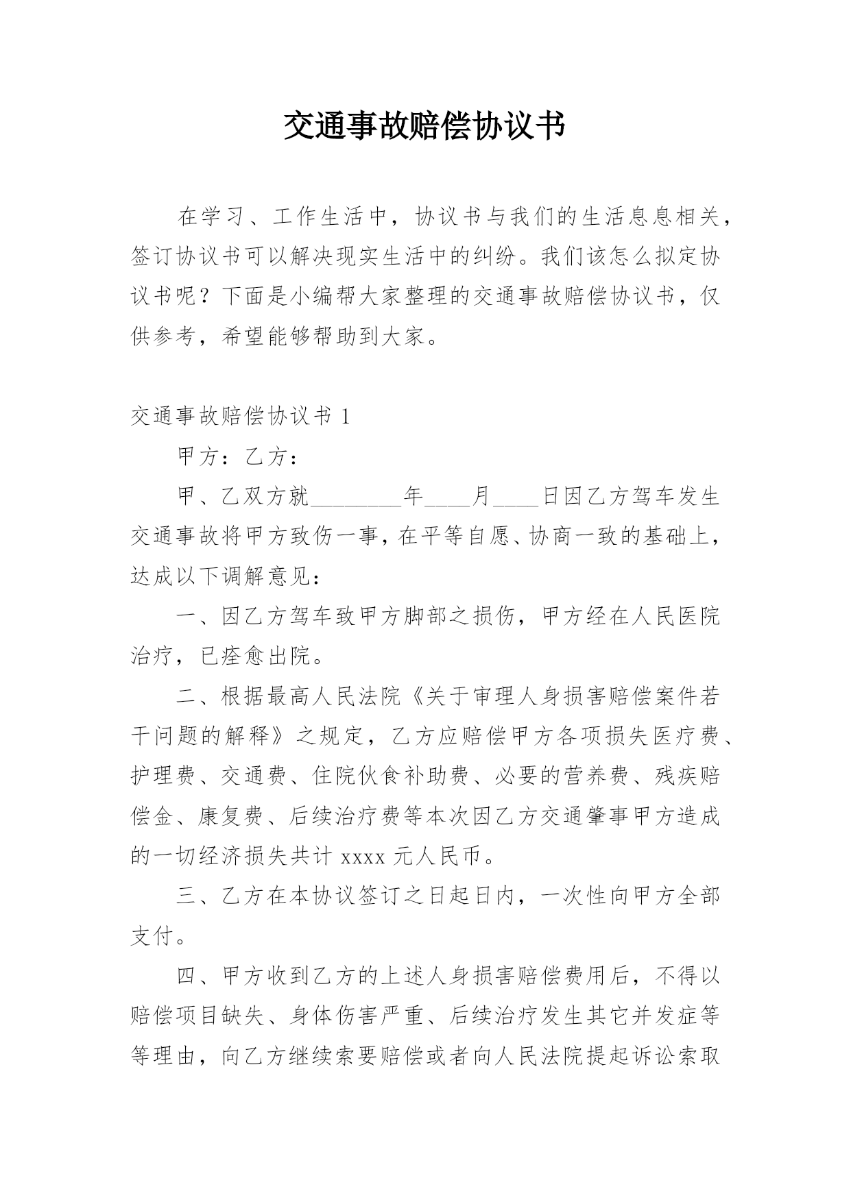 交通事故赔偿协议书在学习、工作生活中,协议书与我们的生活息息相关,签订协议书可以解决现实生活中的纠纷。我们该怎么拟定协议书呢?下面是小编帮大家整理的交通事故赔偿协议书,仅供参考,希望能够帮助到大家。交通事故赔偿协议书1甲方:乙方:甲、乙双方就________年____月____日因乙方驾车发生交通事故将甲方致伤一事,在平等自愿、协商一致的基础上,达成以下调解意见:一、因乙方驾车致甲方脚部之损伤,甲方经在人民医院治疗,已痊愈出院。二、根据最高人民法院《关于审理人身损害赔偿案件若干问题的解释》之规定,乙方应赔