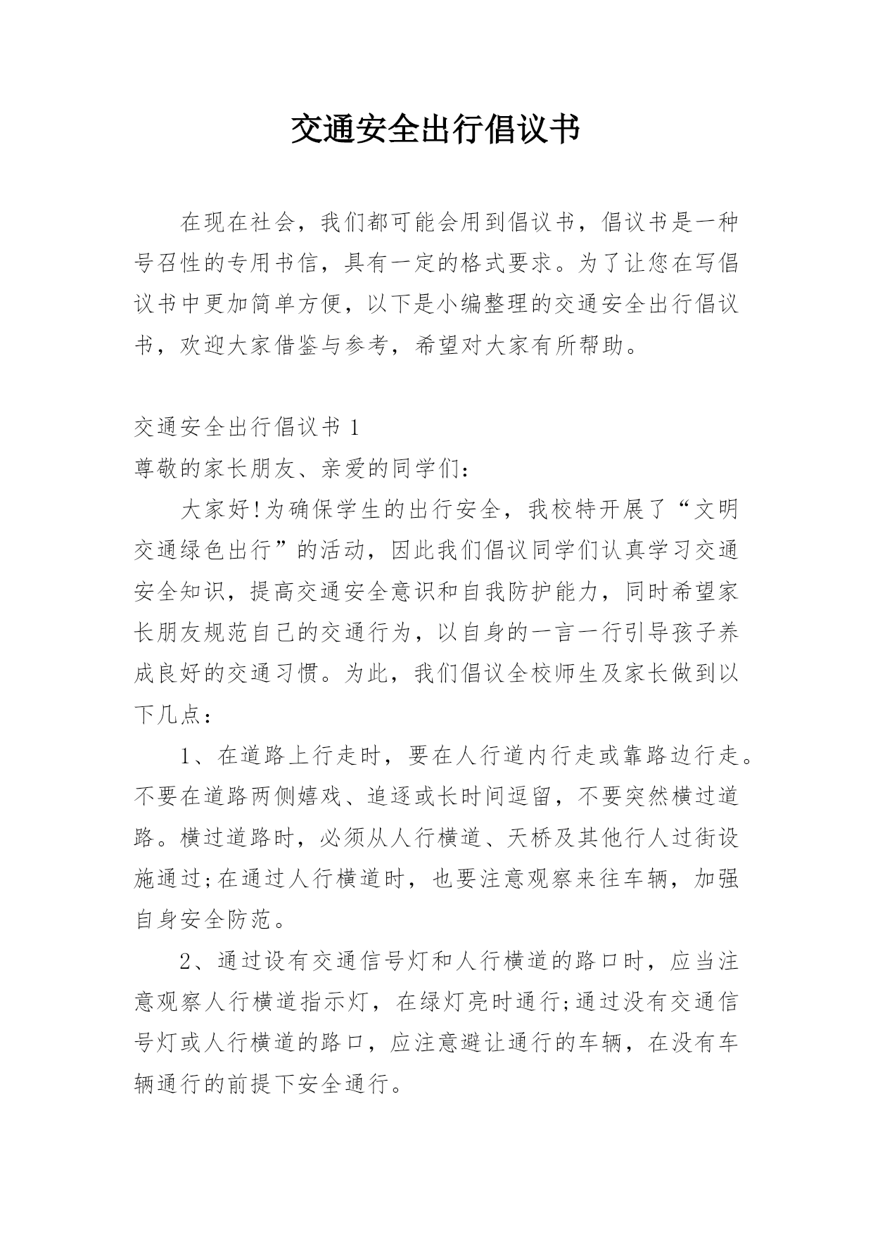 交通安全出行倡议书在现在社会,我们都可能会用到倡议书,倡议书是一种号召性的专用书信,具有一定的格式要求。为了让您在写倡议书中更加简单方便,以下是小编整理的交通安全出行倡议书,欢迎大家借鉴与参考,希望对大家有所帮助。交通安全出行倡议书1尊敬的家长朋友、亲爱的同学们:大家好!为确保学生的出行安全,我校特开展了“文明交通绿色出行”的活动,因此我们倡议同学们认真学习交通安全知识,提高交通安全意识和自我防护能力,同时希望家长朋友规范自己的交通行为,以自身的一言一行引导孩子养成良好的交通习惯。为此,我们倡议全校师生及