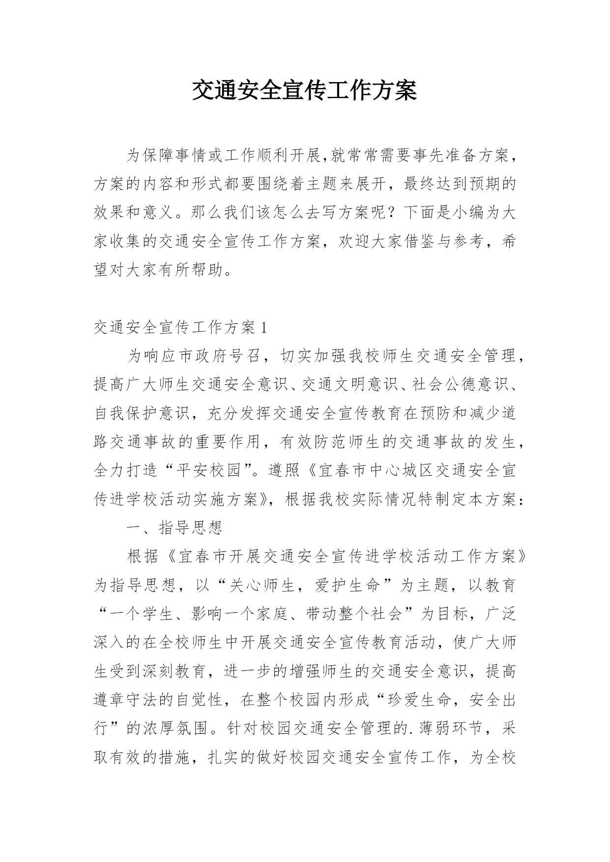 交通安全宣传工作方案为保障事情或工作顺利开展,就常常需要事先准备方案,方案的内容和形式都要围绕着主题来展开,最终达到预期的效果和意义。那么我们该怎么去写方案呢?下面是小编为大家收集的交通安全宣传工作方案,欢迎大家借鉴与参考,希望对大家有所帮助。交通安全宣传工作方案1为响应市政府号召,切实加强我校师生交通安全管理,提高广大师生交通安全意识、交通文明意识、社会公德意识、自我保护意识,充分发挥交通安全宣传教育在预防和减少道路交通事故的重要作用,有效防范师生的交通事故的发生,全力打造“平安校园”。遵照《宜春市中心