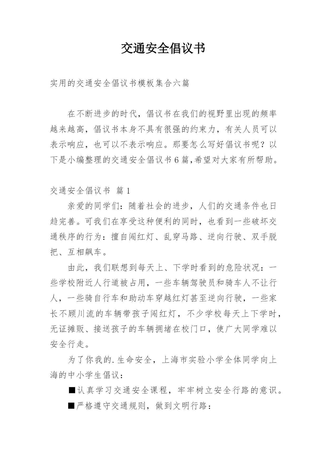 交通安全倡议书实用的交通安全倡议书模板集合六篇在不断进步的时代,倡议书在我们的视野里出现的频率越来越高,倡议书本身不具有很强的约束力,有关人员可以表示响应,也可以不表示响应。那要怎么写好倡议书呢?以下是小编整理的交通安全倡议书6篇,希望对大家有所帮助。交通安全倡议书篇1亲爱的同学们:随着社会的进步,人们的交通条件也日趋完善。可我们在享受这种便利的同时,也看到一些破坏交通秩序的行为:擅自闯红灯、乱穿马路、逆向行驶、双手脱把、互相飙车。由此,我们联想到每天上、下学时看到的危险状况:一些学校附近人行道被占用,一