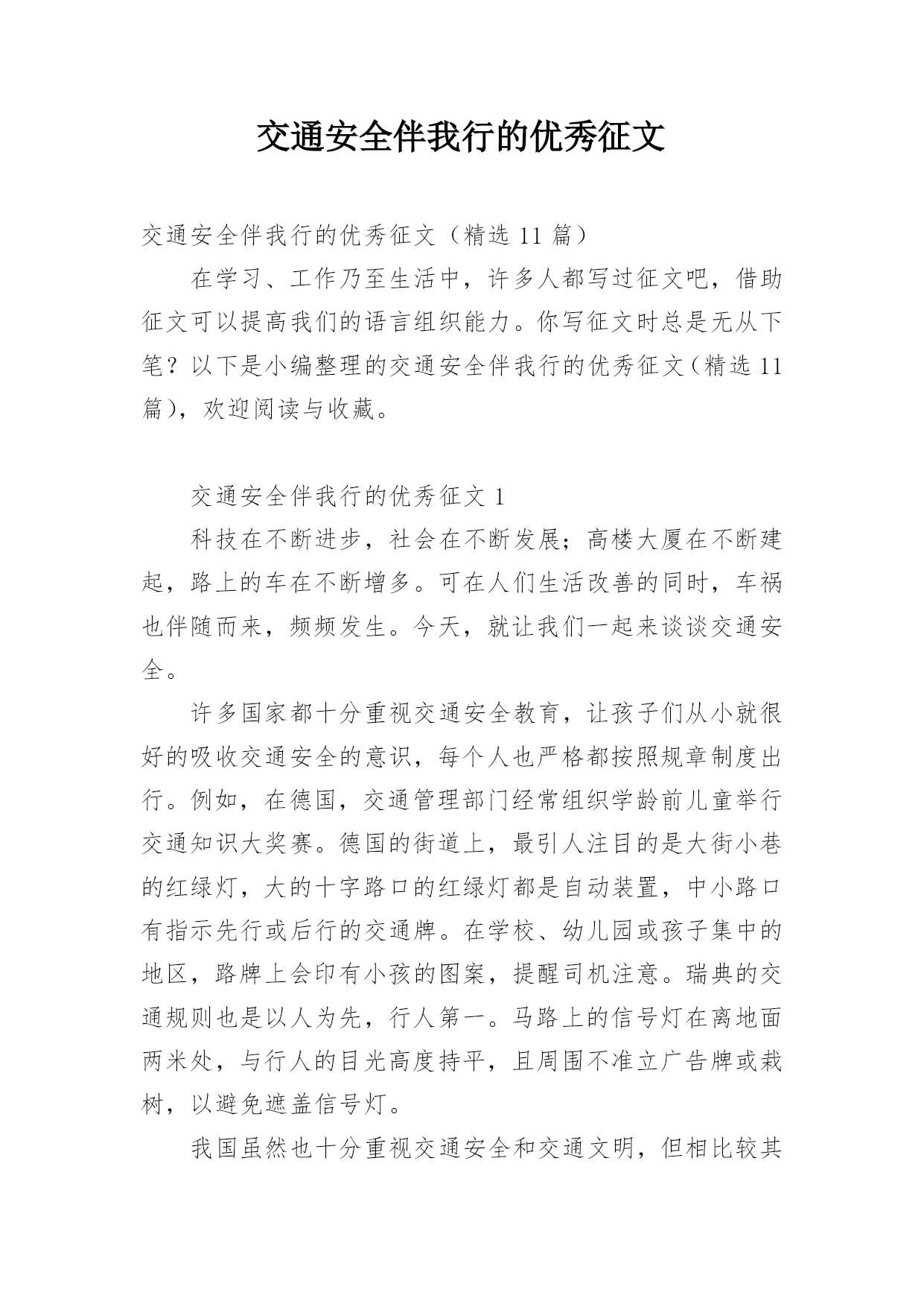 交通安全伴我行的优秀征文交通安全伴我行的优秀征文(精选11篇)在学习、工作乃至生活中,许多人都写过征文吧,借助征文可以提高我们的语言组织能力。你写征文时总是无从下笔?以下是小编整理的交通安全伴我行的优秀征文(精选11篇),欢迎阅读与收藏。交通安全伴我行的优秀征文1科技在不断进步,社会在不断发展;高楼大厦在不断建起,路上的车在不断增多。可在人们生活改善的同时,车祸也伴随而来,频频发生。今天,就让我们一起来谈谈交通安全。许多国家都十分重视交通安全教育,让孩子们从小就很好的吸收交通安全的意识,每个人也严格都按照