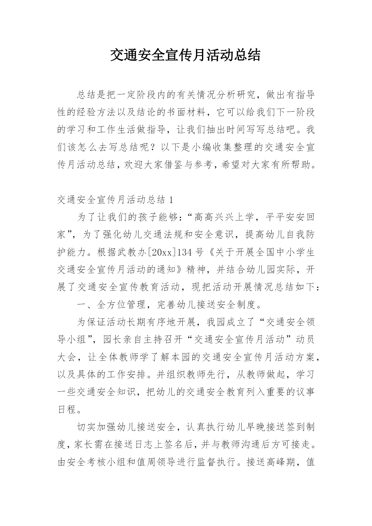 交通安全宣传月活动总结总结是把一定阶段内的有关情况分析研究,做出有指导性的经验方法以及结论的书面材料,它可以给我们下一阶段的学习和工作生活做指导,让我们抽出时间写写总结吧。我们该怎么去写总结呢?以下是小编收集整理的交通安全宣传月活动总结,欢迎大家借鉴与参考,希望对大家有所帮助。交通安全宣传月活动总结1为了让我们的孩子能够:“高高兴兴上学,平平安安回家”,为了强化幼儿交通法规和安全意识,提高幼儿自我防护能力。根据武教办[20xx]134号《关于开展全国中小学生交通安全宣传月活动的通知》精神,并结合幼儿园实际