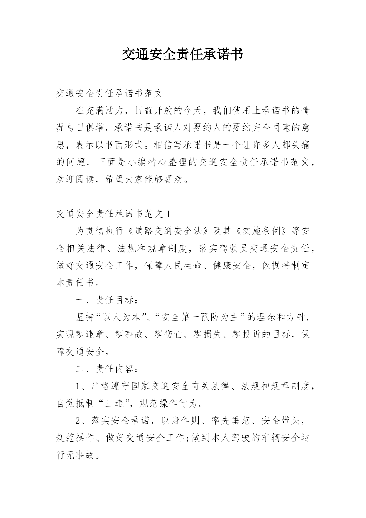 交通安全责任承诺书交通安全责任承诺书范文在充满活力,日益开放的今天,我们使用上承诺书的情况与日俱增,承诺书是承诺人对要约人的要约完全同意的意思,表示以书面形式。相信写承诺书是一个让许多人都头痛的问题,下面是小编精心整理的交通安全责任承诺书范文,欢迎阅读,希望大家能够喜欢。交通安全责任承诺书范文1为贯彻执行《道路交通安全法》及其《实施条例》等安全相关法律、法规和规章制度,落实驾驶员交通安全责任,做好交通安全工作,保障人民生命、健康安全,依据特制定本责任书。一、责任目标:坚持“以人为本”、“安全第一预防为主”