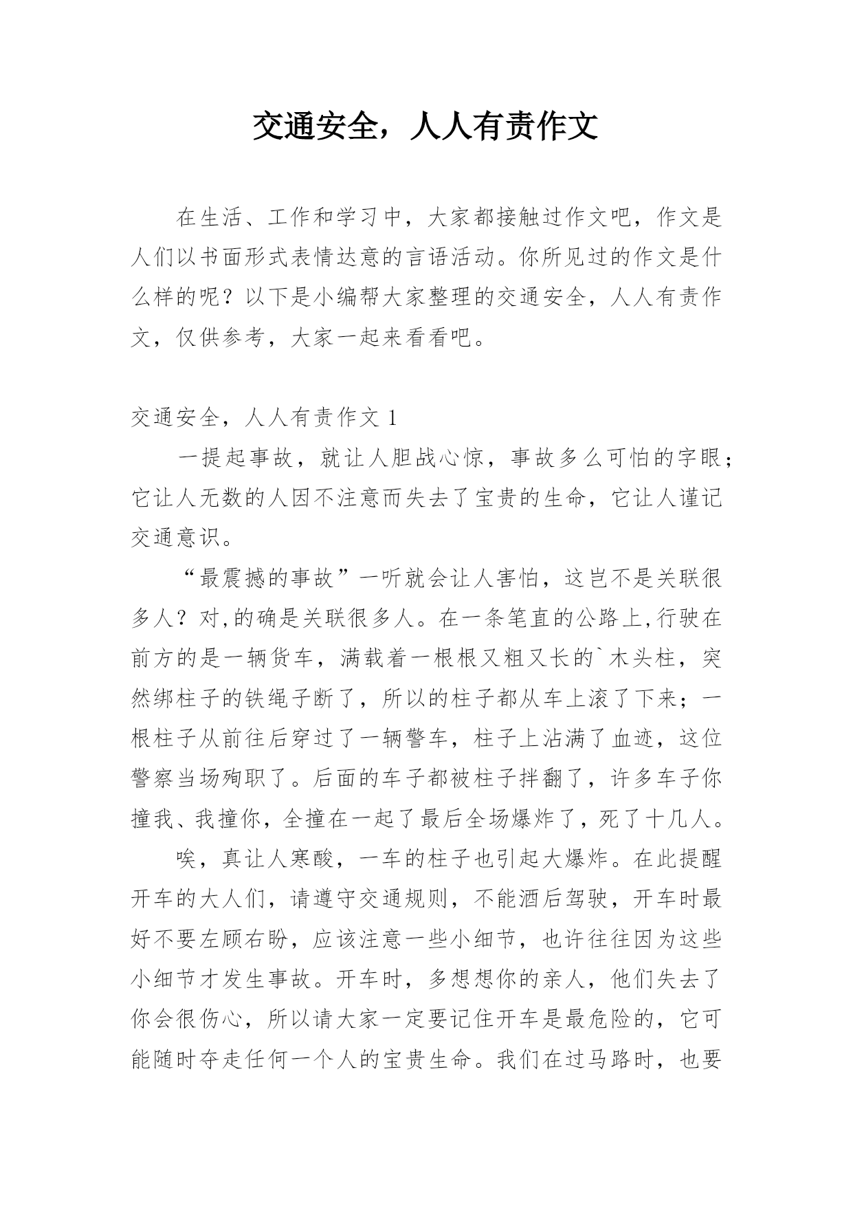 交通安全,人人有责作文在生活、工作和学习中,大家都接触过作文吧,作文是人们以书面形式表情达意的言语活动。你所见过的作文是什么样的呢?以下是小编帮大家整理的交通安全,人人有责作文,仅供参考,大家一起来看看吧。交通安全,人人有责作文1一提起事故,就让人胆战心惊,事故多么可怕的字眼;它让人无数的人因不注意而失去了宝贵的生命,它让人谨记交通意识。“最震撼的事故”一听就会让人害怕,这岂不是关联很多人?对,的确是关联很多人。在一条笔直的公路上,行驶在前方的是一辆货车,满载着一根根又粗又长的`木头柱,突然绑柱子的铁绳子