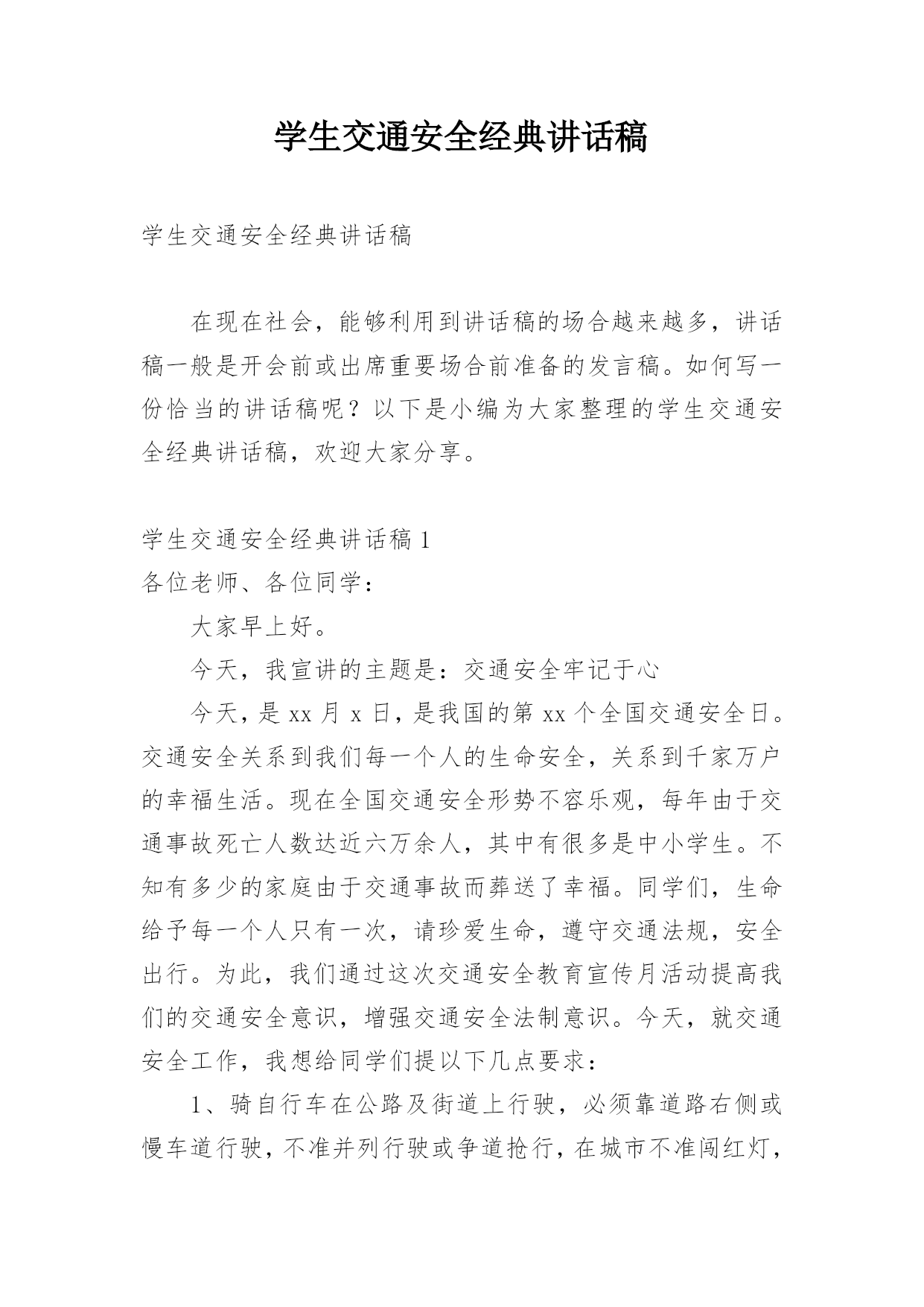 学生交通安全经典讲话稿学生交通安全经典讲话稿在现在社会,能够利用到讲话稿的场合越来越多,讲话稿一般是开会前或出席重要场合前准备的发言稿。如何写一份恰当的讲话稿呢?以下是小编为大家整理的学生交通安全经典讲话稿,欢迎大家分享。学生交通安全经典讲话稿1各位老师、各位同学:大家早上好。今天,我宣讲的主题是:交通安全牢记于心今天,是xx月x日,是我国的第xx个全国交通安全日。交通安全关系到我们每一个人的生命安全,关系到千家万户的幸福生活。现在全国交通安全形势不容乐观,每年由于交通事故死亡人数达近六万余人,其中有很多