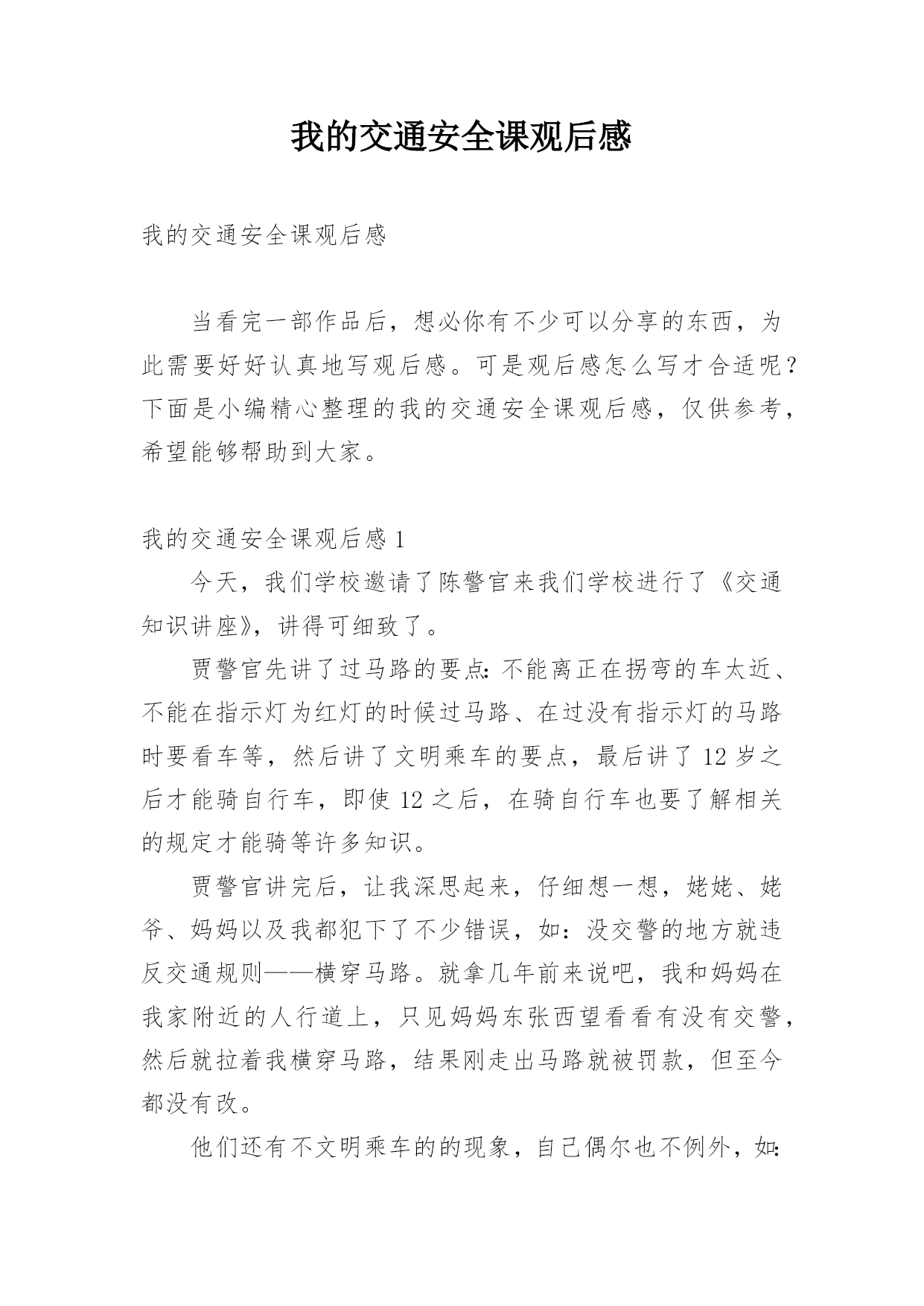 我的交通安全课观后感我的交通安全课观后感当看完一部作品后,想必你有不少可以分享的东西,为此需要好好认真地写观后感。可是观后感怎么写才合适呢?下面是小编精心整理的我的交通安全课观后感,仅供参考,希望能够帮助到大家。我的交通安全课观后感1今天,我们学校邀请了陈警官来我们学校进行了《交通知识讲座》,讲得可细致了。贾警官先讲了过马路的要点:不能离正在拐弯的车太近、不能在指示灯为红灯的时候过马路、在过没有指示灯的马路时要看车等,然后讲了文明乘车的要点,最后讲了12岁之后才能骑自行车,即使12之后,在骑自行车也要了解