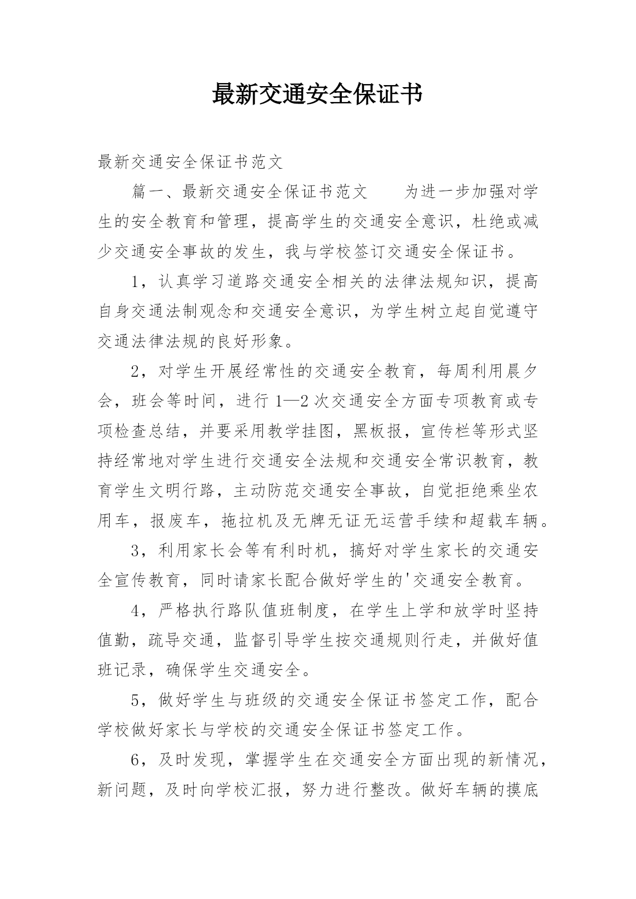 最新交通安全保证书最新交通安全保证书范文篇一、最新交通安全保证书范文为进一步加强对学生的安全教育和管理,提高学生的交通安全意识,杜绝或减少交通安全事故的发生,我与学校签订交通安全保证书。1,认真学习道路交通安全相关的法律法规知识,提高自身交通法制观念和交通安全意识,为学生树立起自觉遵守交通法律法规的良好形象。2,对学生开展经常性的交通安全教育,每周利用晨夕会,班会等时间,进行1—2次交通安全方面专项教育或专项检查总结,并要采用教学挂图,黑板报,宣传栏等形式坚持经常地对学生进行交通安全法规和交通安全常识教育