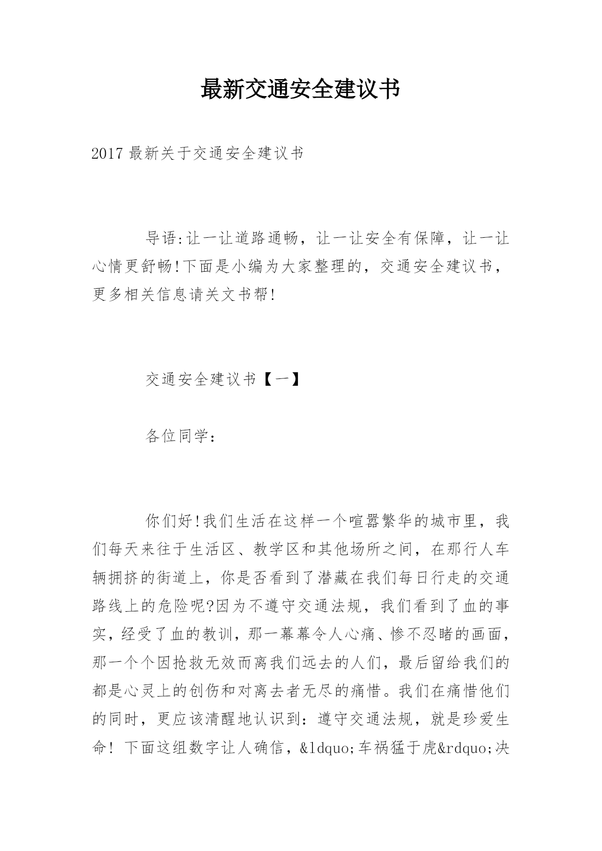 最新交通安全建议书2017最新关于交通安全建议书导语:让一让道路通畅,让一让安全有保障,让一让心情更舒畅!下面是小编为大家整理的,交通安全建议书,更多相关信息请关文书帮!交通安全建议书【一】各位同学:你们好!我们生活在这样一个喧嚣繁华的城市里,我们每天来往于生活区、教学区和其他场所之间,在那行人车辆拥挤的街道上,你是否看到了潜藏在我们每日行走的交通路线上的危险呢?因为不遵守交通法规,我们看到了血的事实,经受了血的教训,那一幕幕令人心痛、惨不忍睹的画面,那一个个因抢救无效而离我们远去的人们,最后留给我们的都