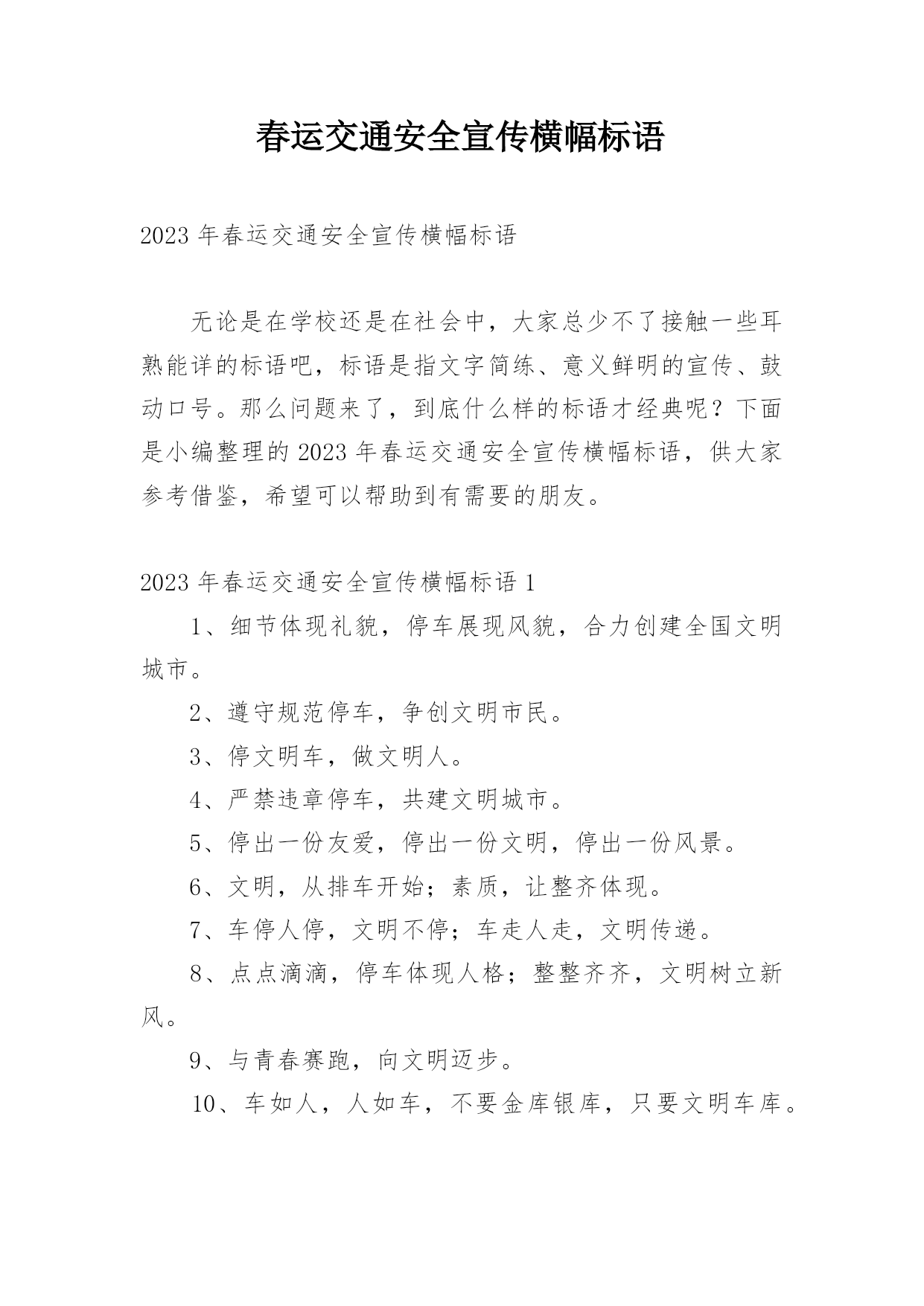 春运交通安全宣传横幅标语2023年春运交通安全宣传横幅标语无论是在学校还是在社会中,大家总少不了接触一些耳熟能详的标语吧,标语是指文字简练、意义鲜明的宣传、鼓动口号。那么问题来了,到底什么样的标语才经典呢?下面是小编整理的2023年春运交通安全宣传横幅标语,供大家参考借鉴,希望可以帮助到有需要的朋友。2023年春运交通安全宣传横幅标语11、细节体现礼貌,停车展现风貌,合力创建全国文明城市。2、遵守规范停车,争创文明市民。3、停文明车,做文明人。4、严禁违章停车,共建文明城市。5、停出一份友爱,停出一份文明