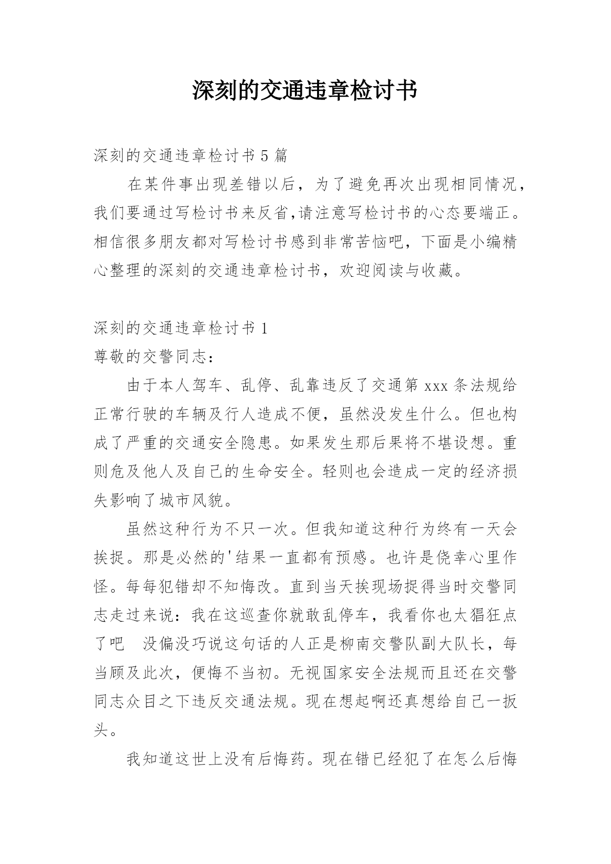 深刻的交通违章检讨书深刻的交通违章检讨书5篇在某件事出现差错以后,为了避免再次出现相同情况,我们要通过写检讨书来反省,请注意写检讨书的心态要端正。相信很多朋友都对写检讨书感到非常苦恼吧,下面是小编精心整理的深刻的交通违章检讨书,欢迎阅读与收藏。深刻的交通违章检讨书1尊敬的交警同志:由于本人驾车、乱停、乱靠违反了交通第xxx条法规给正常行驶的车辆及行人造成不便,虽然没发生什么。但也构成了严重的交通安全隐患。如果发生那后果将不堪设想。重则危及他人及自己的生命安全。轻则也会造成一定的经济损失影响了城市风貌。虽然