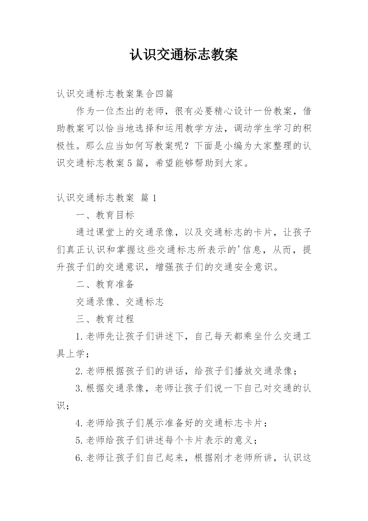 认识交通标志教案认识交通标志教案集合四篇作为一位杰出的老师,很有必要精心设计一份教案,借助教案可以恰当地选择和运用教学方法,调动学生学习的积极性。那么应当如何写教案呢?下面是小编为大家整理的认识交通标志教案5篇,希望能够帮助到大家。认识交通标志教案篇1一、教育目标通过课堂上的交通录像,以及交通标志的卡片,让孩子们真正认识和掌握这些交通标志所表示的'信息,从而,提升孩子们的交通意识,增强孩子们的交通安全意识。二、教育准备交通录像、交通标志三、教育过程1.老师先让孩子们讲述下,自己每天都乘坐什么交通工具上学;