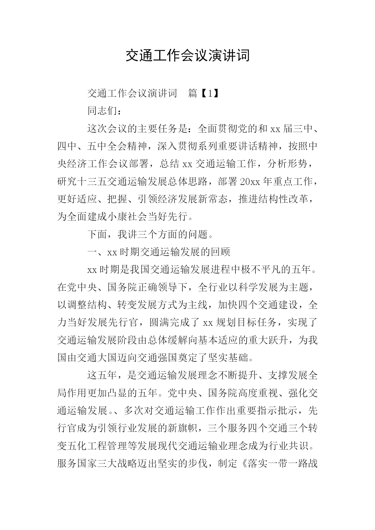 交通工作会议演讲词交通工作会议演讲词篇【1】同志们:这次会议的主要任务是:全面贯彻党的和xx届三中、四中、五中全会精神,深入贯彻系列重要讲话精神,按照中央经济工作会议部署,总结xx交通运输工作,分析形势,研究十三五交通运输发展总体思路,部署20xx年重点工作,更好适应、把握、引领经济发展新常态,推进结构性改革,为全面建成小康社会当好先行。下面,我讲三个方面的问题。一、xx时期交通运输发展的回顾xx时期是我国交通运输发展进程中极不平凡的五年。在党中央、国务院正确领导下,全行业以科学发展为主题,以调整结构、转