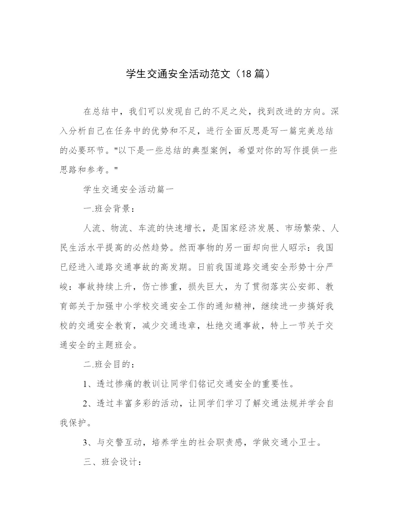学生交通安全活动范文(18篇)在总结中,我们可以发现自己的不足之处,找到改进的方向。深入分析自己在任务中的优势和不足,进行全面反思是写一篇完美总结的必要环节。"以下是一些总结的典型案例,希望对你的写作提供一些思路和参考。"学生交通安全活动篇一一.班会背景:人流、物流、车流的快速增长,是国家经济发展、市场繁荣、人民生活水平提高的必然趋势。然而事物的另一面却向世人昭示:我国已经进入道路交通事故的高发期。日前我国道路交通安全形势十分严峻:事故持续上升,伤亡惨重,损失巨大,为了贯彻落实公安部、教育部关于加强中小学