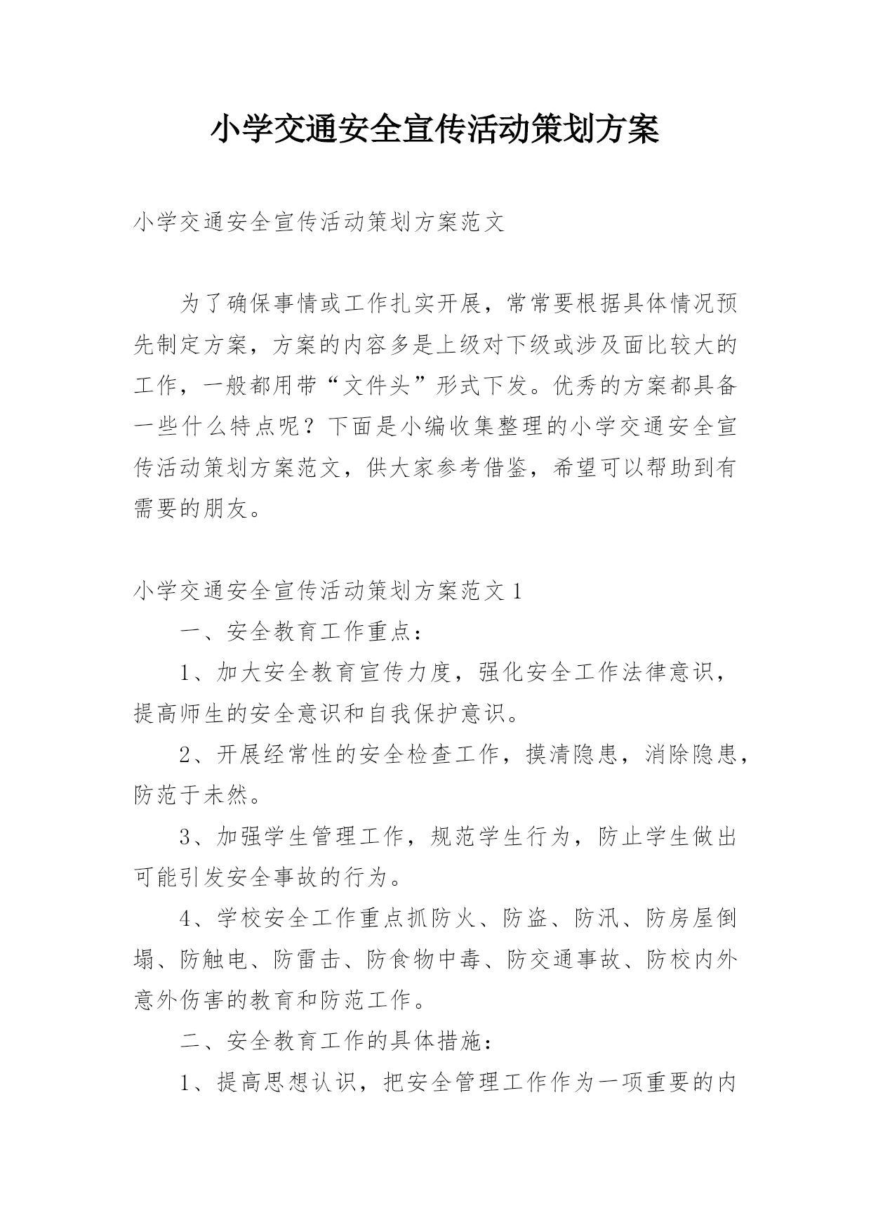 小学交通安全宣传活动策划方案小学交通安全宣传活动策划方案范文为了确保事情或工作扎实开展,常常要根据具体情况预先制定方案,方案的内容多是上级对下级或涉及面比较大的工作,一般都用带“文件头”形式下发。优秀的方案都具备一些什么特点呢?下面是小编收集整理的小学交通安全宣传活动策划方案范文,供大家参考借鉴,希望可以帮助到有需要的朋友。小学交通安全宣传活动策划方案范文1一、安全教育工作重点:1、加大安全教育宣传力度,强化安全工作法律意识,提高师生的安全意识和自我保护意识。2、开展经常性的安全检查工作,摸清隐患,消除隐
