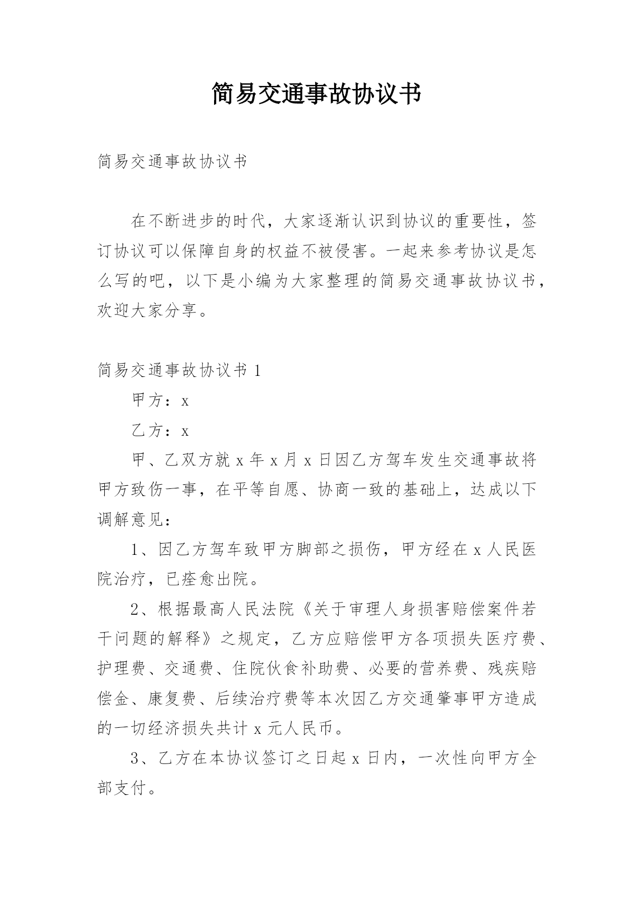 简易交通事故协议书简易交通事故协议书在不断进步的时代,大家逐渐认识到协议的重要性,签订协议可以保障自身的权益不被侵害。一起来参考协议是怎么写的吧,以下是小编为大家整理的简易交通事故协议书,欢迎大家分享。简易交通事故协议书1甲方:x乙方:x甲、乙双方就x年x月x日因乙方驾车发生交通事故将甲方致伤一事,在平等自愿、协商一致的基础上,达成以下调解意见:1、因乙方驾车致甲方脚部之损伤,甲方经在x人民医院治疗,已痊愈出院。2、根据最高人民法院《关于审理人身损害赔偿案件若干问题的解释》之规定,乙方应赔偿甲方各项损失医