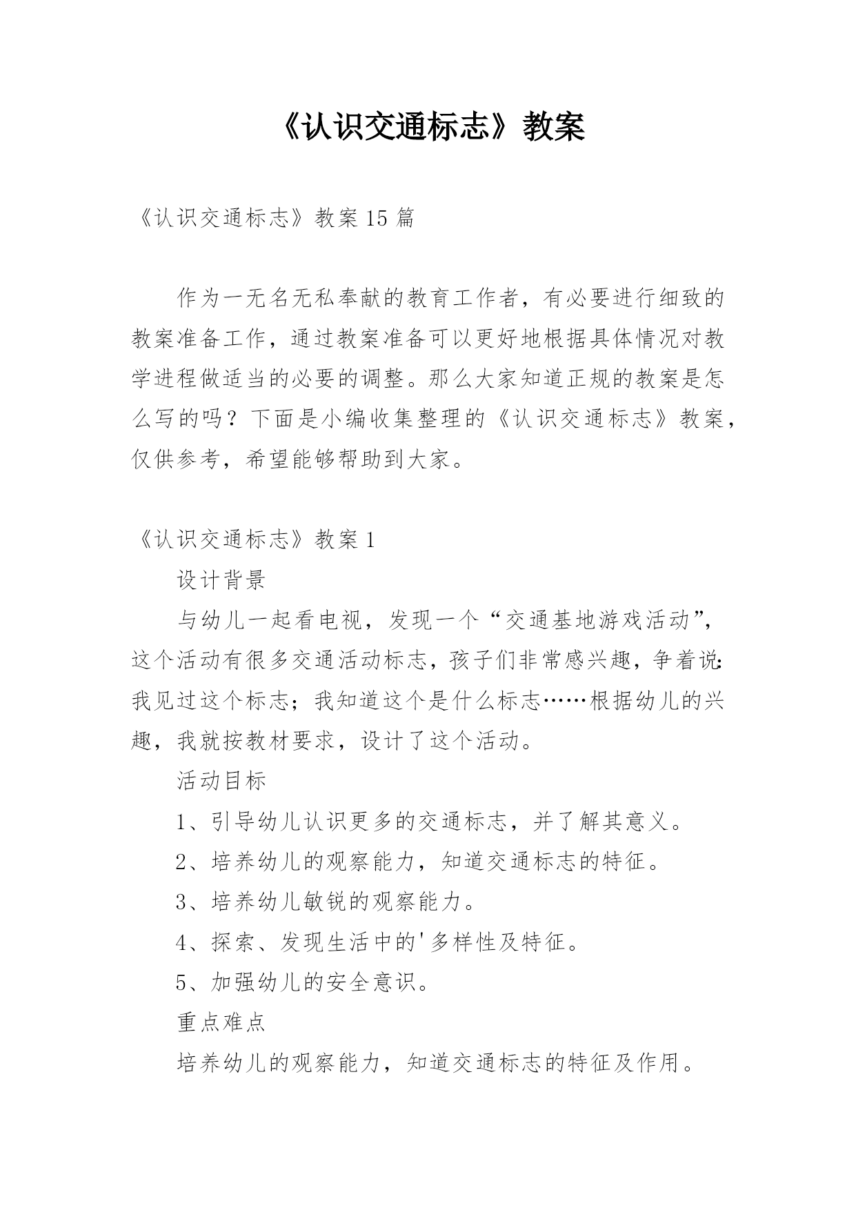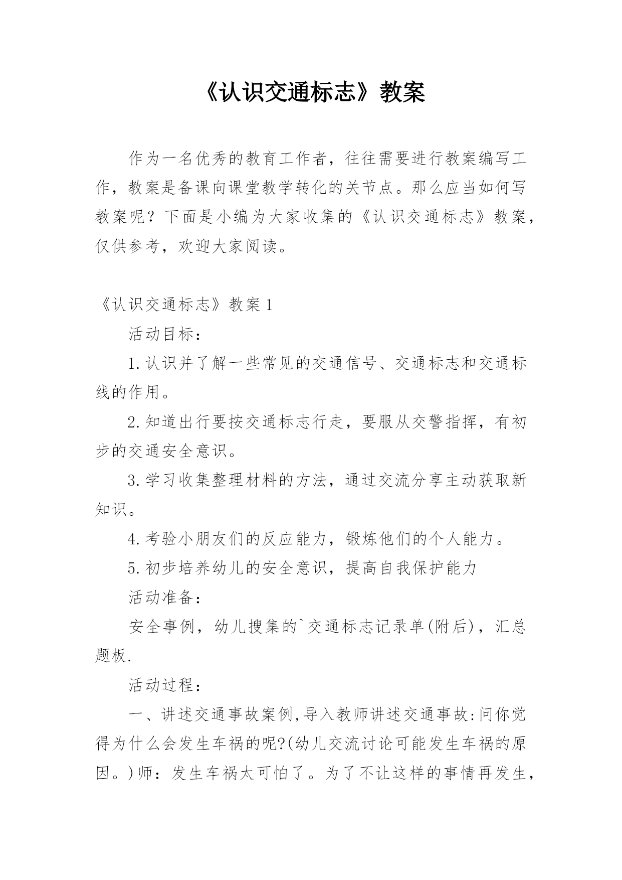 《认识交通标志》教案《认识交通标志》教案15篇作为一无名无私奉献的教育工作者,有必要进行细致的教案准备工作,通过教案准备可以更好地根据具体情况对教学进程做适当的必要的调整。那么大家知道正规的教案是怎么写的吗?下面是小编收集整理的《认识交通标志》教案,仅供参考,希望能够帮助到大家。《认识交通标志》教案1设计背景与幼儿一起看电视,发现一个“交通基地游戏活动”,这个活动有很多交通活动标志,孩子们非常感兴趣,争着说:我见过这个标志;我知道这个是什么标志……根据幼儿的兴趣,我就按教材要求,设计了这个活动。活动目标1