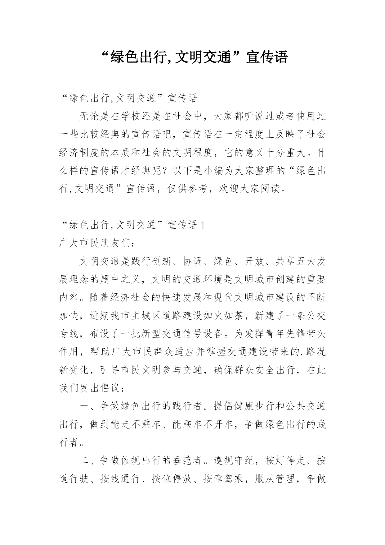 “绿色出行,文明交通”宣传语“绿色出行,文明交通”宣传语无论是在学校还是在社会中,大家都听说过或者使用过一些比较经典的宣传语吧,宣传语在一定程度上反映了社会经济制度的本质和社会的文明程度,它的意义十分重大。什么样的宣传语才经典呢?以下是小编为大家整理的“绿色出行,文明交通”宣传语,仅供参考,欢迎大家阅读。“绿色出行,文明交通”宣传语1广大市民朋友们:文明交通是践行创新、协调、绿色、开放、共享五大发展理念的题中之义,文明的交通环境是文明城市创建的重要内容。随着经济社会的快速发展和现代文明城市建设的不断加快,