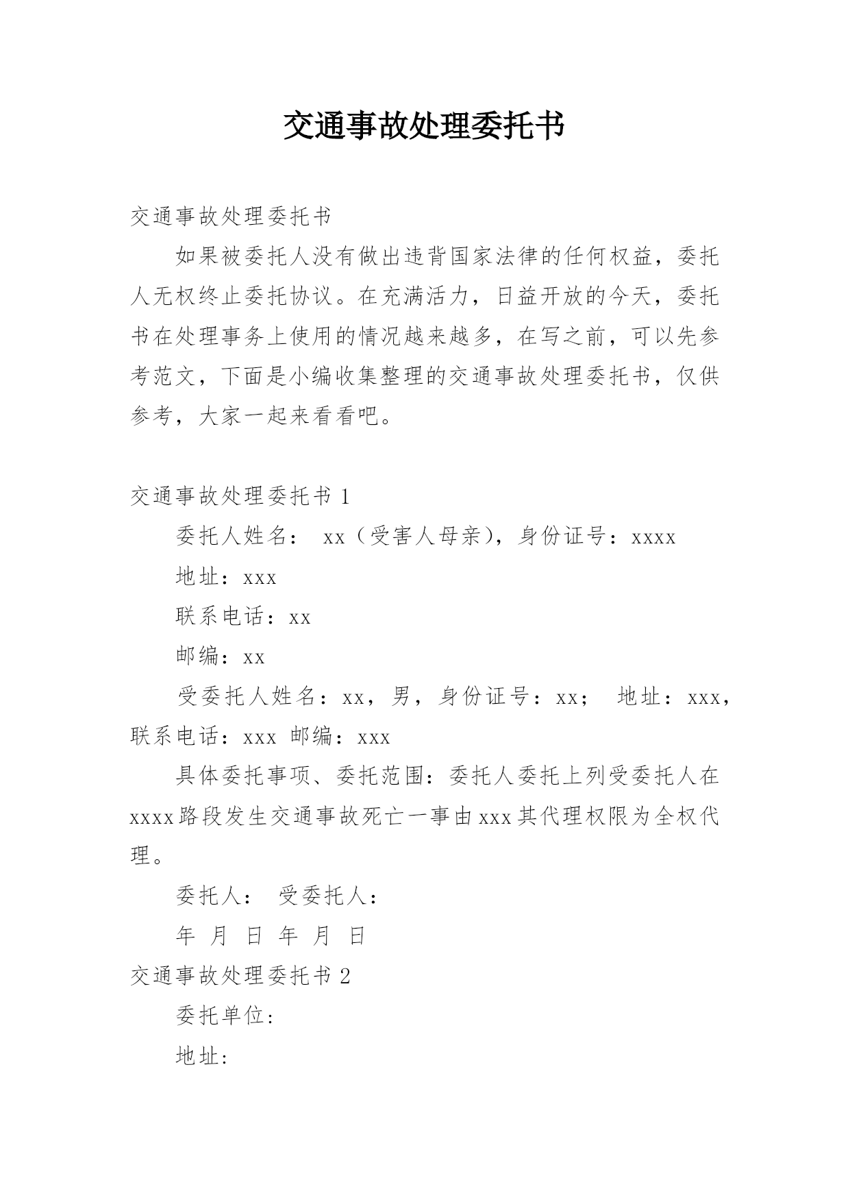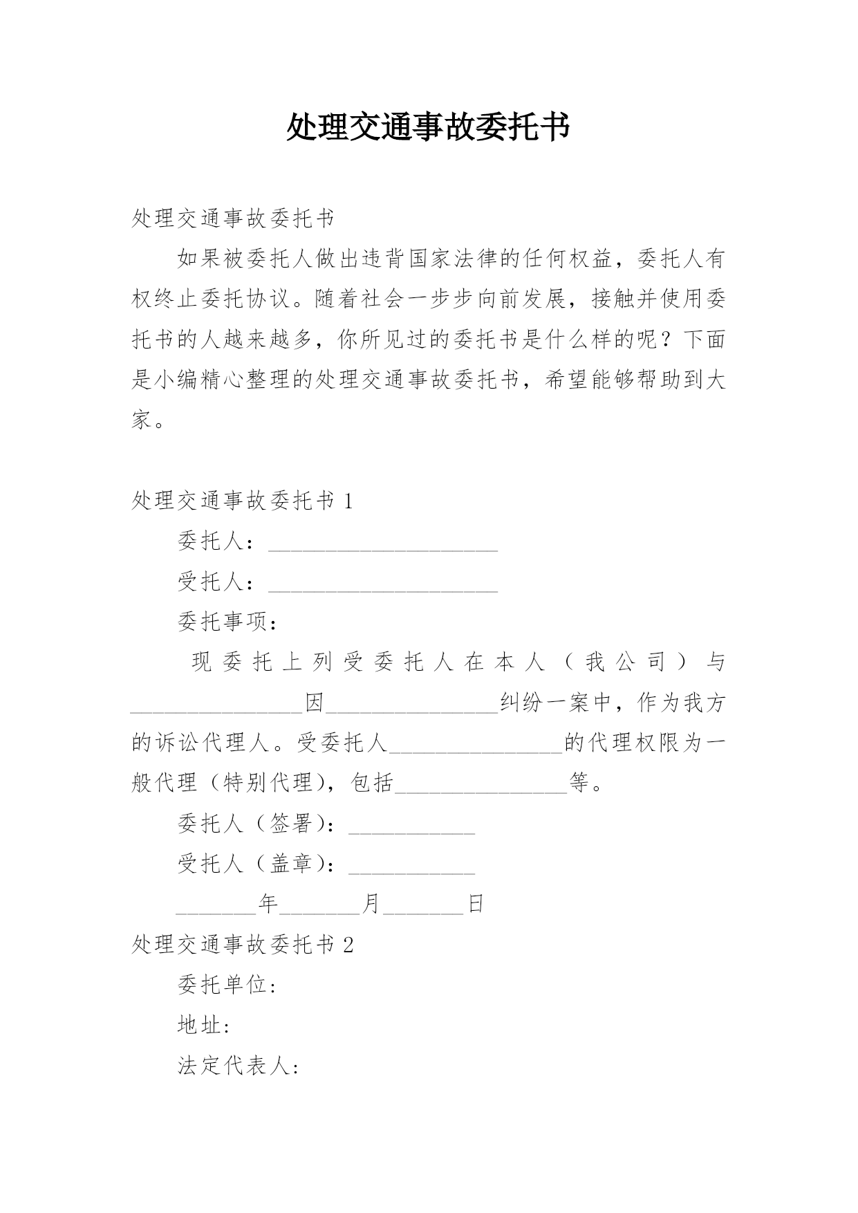 处理交通事故委托书处理交通事故委托书如果被委托人做出违背国家法律的任何权益,委托人有权终止委托协议。随着社会一步步向前发展,接触并使用委托书的人越来越多,你所见过的委托书是什么样的呢?下面是小编精心整理的处理交通事故委托书,希望能够帮助到大家。处理交通事故委托书1委托人:____________________受托人:____________________委托事项:现委托上列受委托人在本人(我公司)与_______________因_______________纠纷一案中,作为我方的诉讼代理人。受委托人
