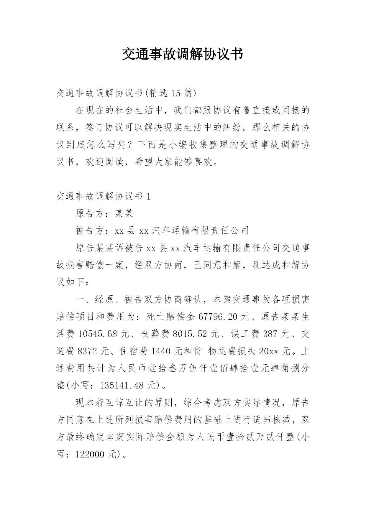 交通事故调解协议书交通事故调解协议书(精选15篇)在现在的社会生活中,我们都跟协议有着直接或间接的联系,签订协议可以解决现实生活中的纠纷。那么相关的协议到底怎么写呢?下面是小编收集整理的交通事故调解协议书,欢迎阅读,希望大家能够喜欢。交通事故调解协议书1原告方:某某被告方:xx县xx汽车运输有限责任公司原告某某诉被告xx县xx汽车运输有限责任公司交通事故损害赔偿一案,经双方协商,已同意和解,现达成和解协议如下:一、经原、被告双方协商确认,本案交通事故各项损害赔偿项目和费用为:死亡赔偿金67796.20元、