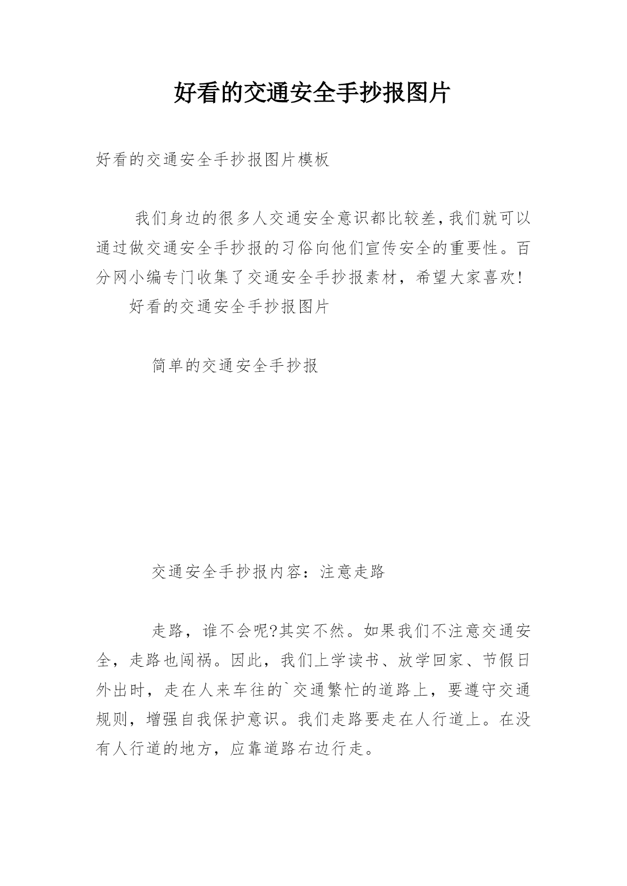 好看的交通安全手抄报图片好看的交通安全手抄报图片模板我们身边的很多人交通安全意识都比较差,我们就可以通过做交通安全手抄报的习俗向他们宣传安全的重要性。百分网小编专门收集了交通安全手抄报素材,希望大家喜欢!好看的交通安全手抄报图片简单的交通安全手抄报交通安全手抄报内容:注意走路走路,谁不会呢?其实不然。如果我们不注意交通安全,走路也闯祸。因此,我们上学读书、放学回家、节假日外出时,走在人来车往的`交通繁忙的道路上,要遵守交通规则,增强自我保护意识。我们走路要走在人行道上。在没有人行道的地方,应靠道路右边行走