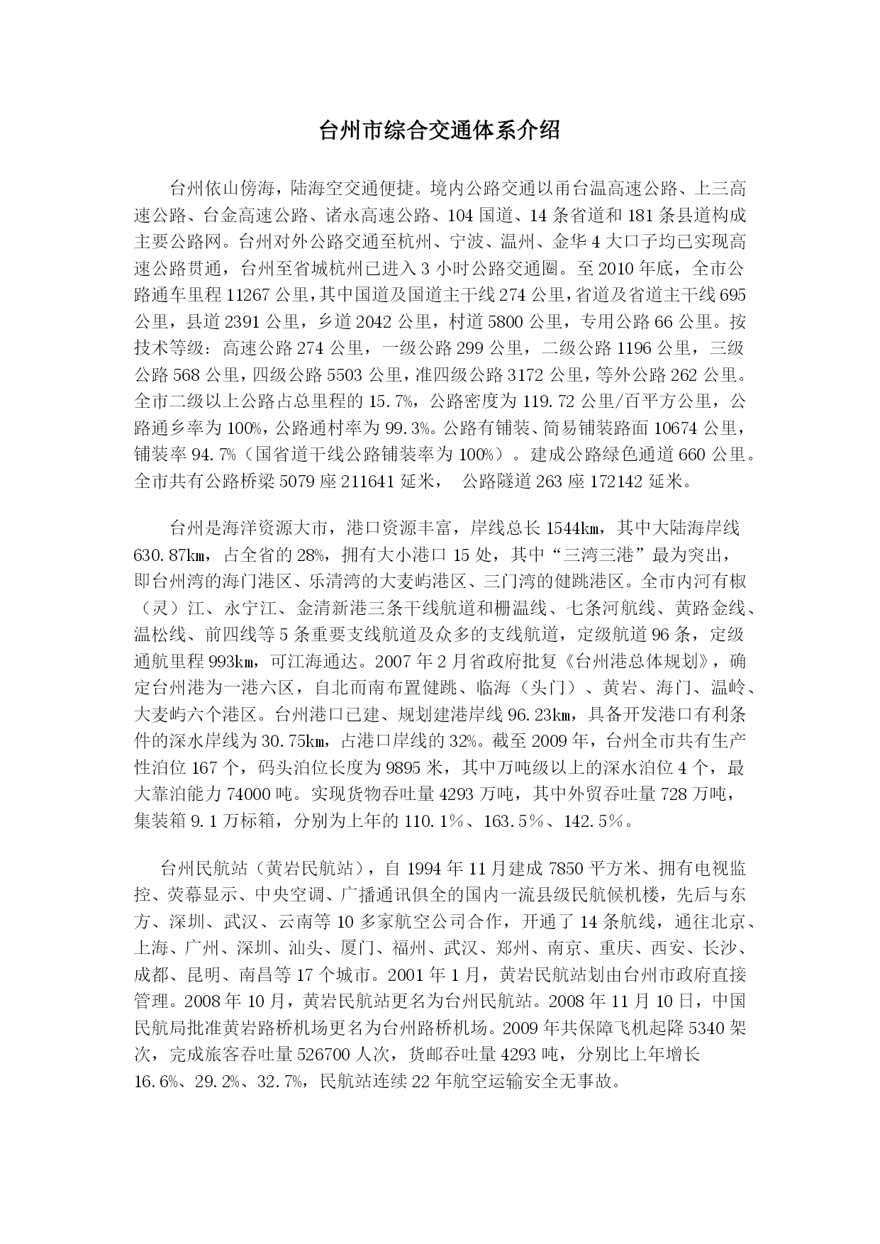 台州市综合交通体系介绍台州依山傍海,陆海空交通便捷。境内公路交通以甬台温高速公路、上三高速公路、台金高速公路、诸永高速公路、104国道、14条省道和181条县道构成主要公路网。台州对外公路交通至杭州、宁波、温州、金华4大口子均已实现高速公路贯通,台州至省城杭州已进入3小时公路交通圈。至2010年底,全市公路通车里程11267公里,其中国道及国道主干线274公里,省道及省道主干线695公里,县道2391公里,乡道2042公里,村道5800公里,专用公路66公里。按技术等级:高速公路274公里,一级公路299