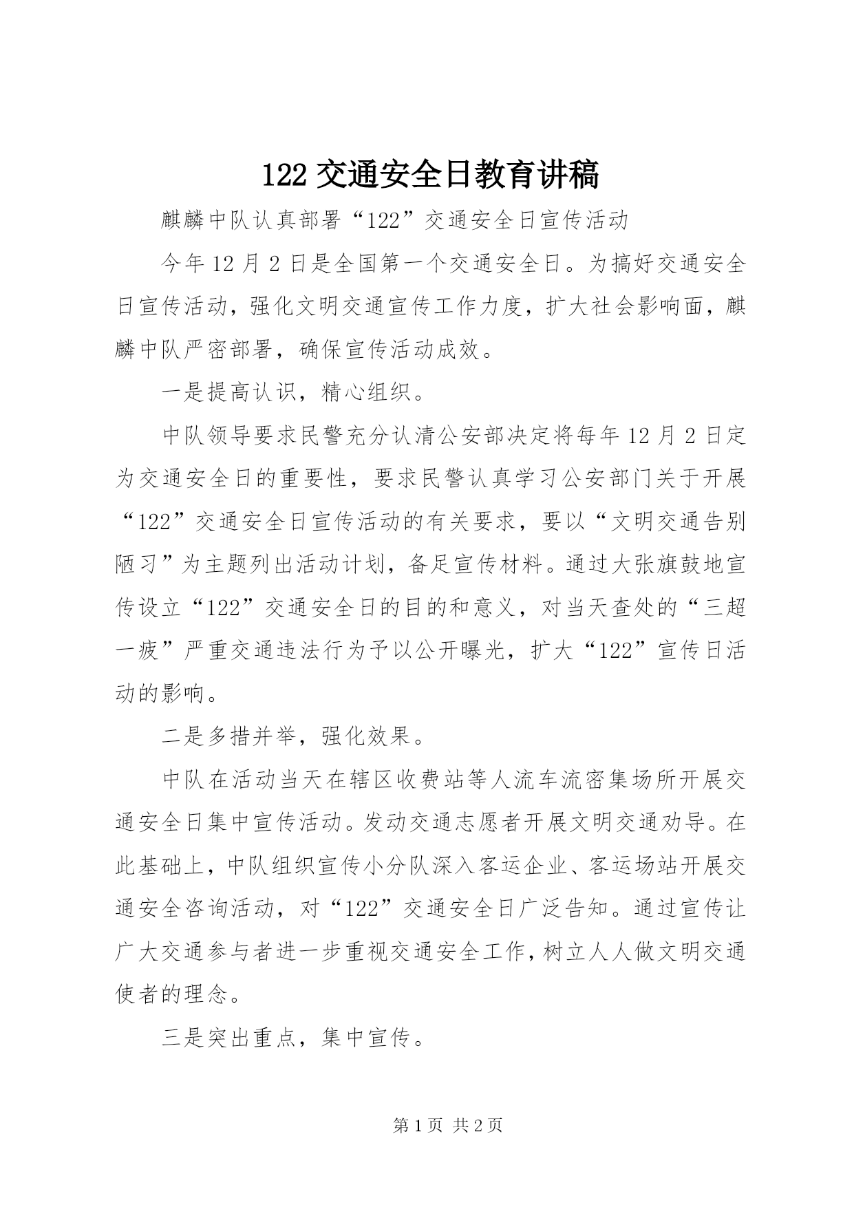 第PAGE\*Arabic\*MERGEFORMAT2页共NUMPAGES\*MERGEFORMAT2页122交通安全日教育讲稿麒麟中队认真部署“122”交通安全日宣传活动今年12月2日是全国第一个交通安全日。为搞好交通安全日宣传活动,强化文明交通宣传工作力度,扩大社会影响面,麒麟中队严密部署,确保宣传活动成效。一是提高认识,精心组织。中队领导要求民警充分认清公安部决定将每年12月2日定为交通安全日的重要性,要求民警认真学习公安部门关于开展“122”交通安全日宣传活动的有关要求,要以“文明交通