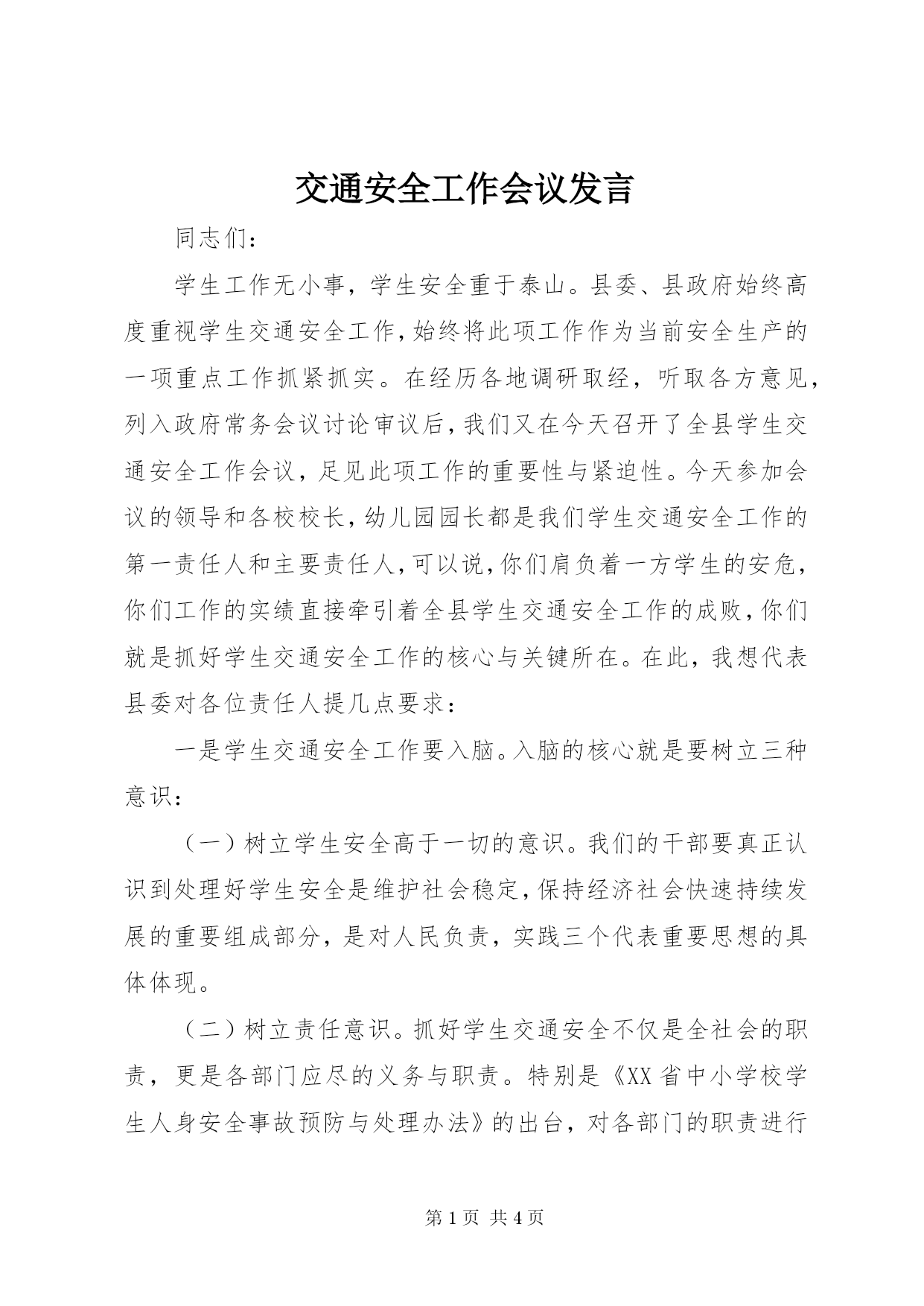 第PAGE\*Arabic\*MERGEFORMAT4页共NUMPAGES\*MERGEFORMAT4页交通安全工作会议发言同志们:学生工作无小事,学生安全重于泰山。县委、县政府始终高度重视学生交通安全工作,始终将此项工作作为当前安全生产的一项重点工作抓紧抓实。在经历各地调研取经,听取各方意见,列入政府常务会议讨论审议后,我们又在今天召开了全县学生交通安全工作会议,足见此项工作的重要性与紧迫性。今天参加会议的领导和各校校长,幼儿园园长都是我们学生交通安全工作的第一责任人和主要责任人,可以说,你