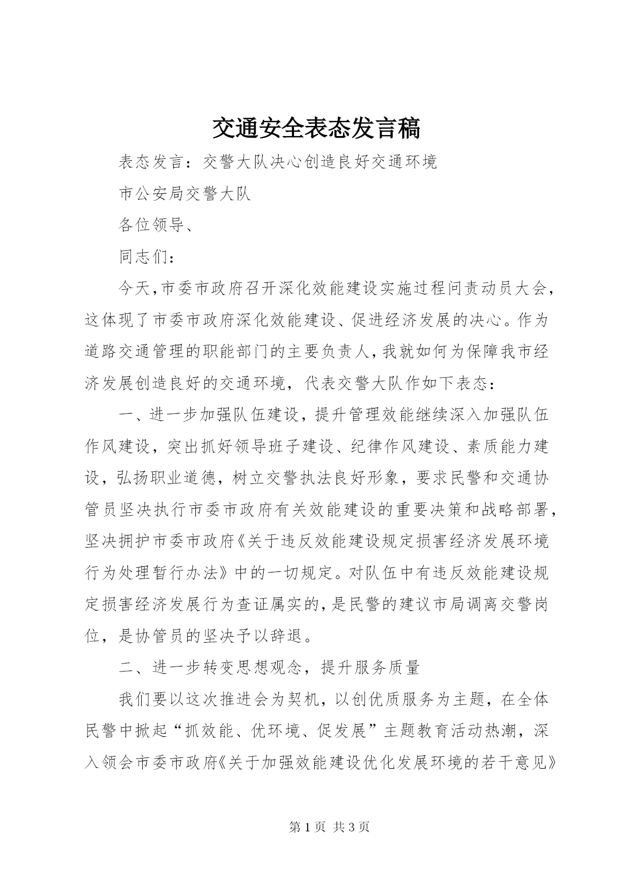 第PAGE\*Arabic\*MERGEFORMAT3页共NUMPAGES\*MERGEFORMAT3页交通安全表态发言稿表态发言:交警大队决心创造良好交通环境市公安局交警大队各位领导、同志们:今天,市委市政府召开深化效能建设实施过程问责动员大会,这体现了市委市政府深化效能建设、促进经济发展的决心。作为道路交通管理的职能部门的主要负责人,我就如何为保障我市经济发展创造良好的交通环境,代表交警大队作如下表态:一、进一步加强队伍建设,提升管理效能继续深入加强队伍作风建设,突出抓好领导班子建设、纪律