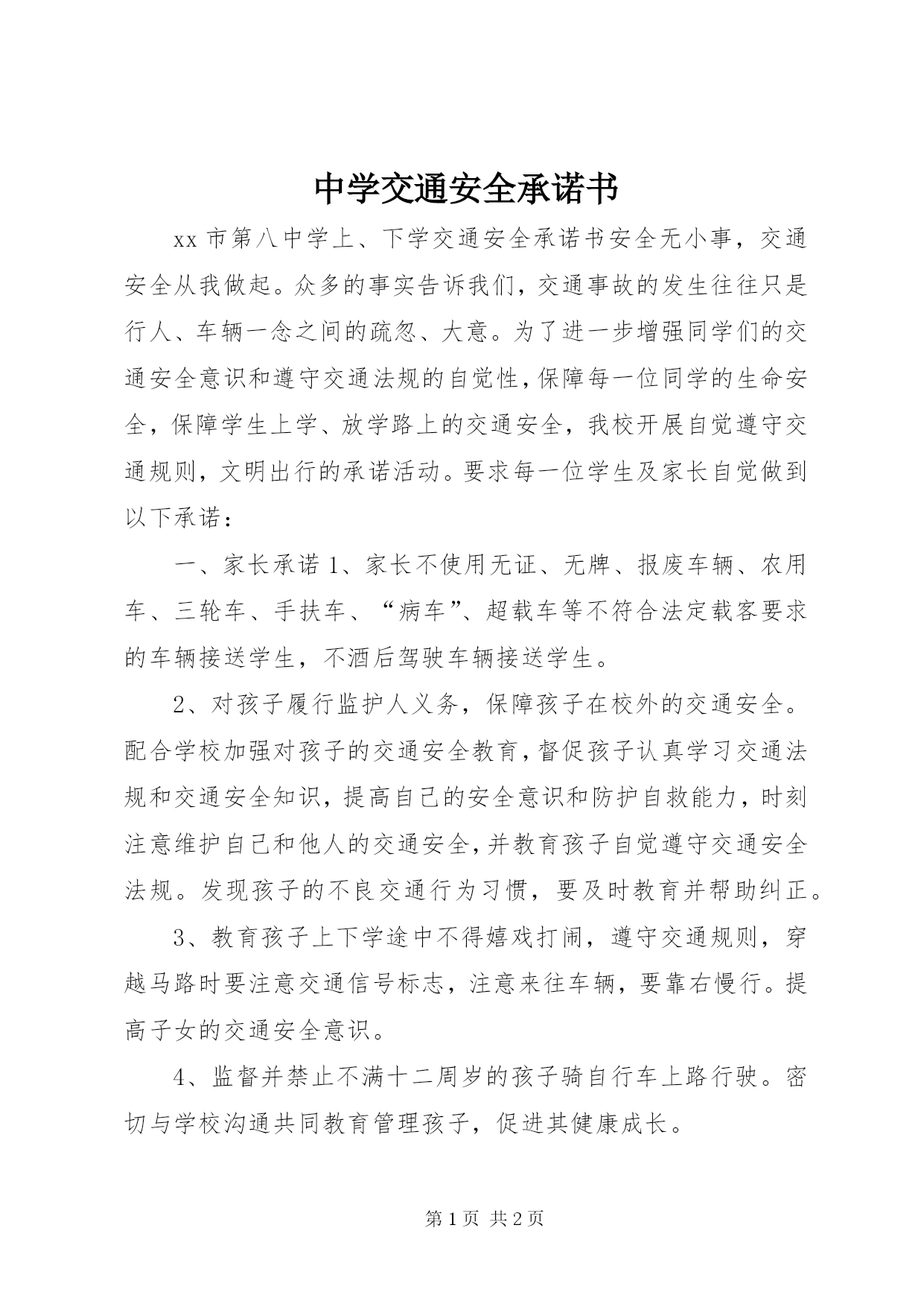 第PAGE\*Arabic\*MERGEFORMAT2页共NUMPAGES\*MERGEFORMAT2页中学交通安全承诺书xx市第八中学上、下学交通安全承诺书安全无小事,交通安全从我做起。众多的事实告诉我们,交通事故的发生往往只是行人、车辆一念之间的疏忽、大意。为了进一步增强同学们的交通安全意识和遵守交通法规的自觉性,保障每一位同学的生命安全,保障学生上学、放学路上的交通安全,我校开展自觉遵守交通规则,文明出行的承诺活动。要求每一位学生及家长自觉做到以下承诺:一、家长承诺1、家长不使用无证、无