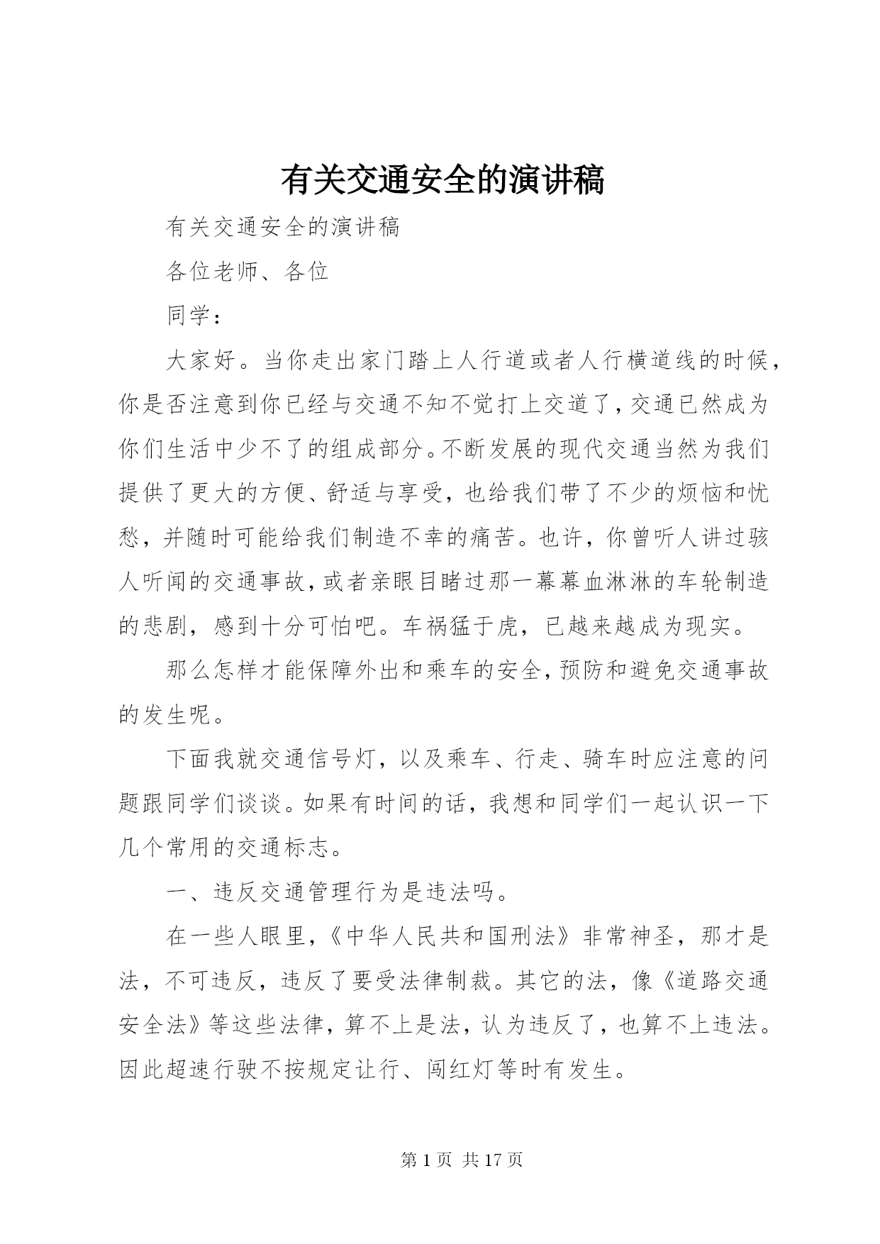 第PAGE\*Arabic\*MERGEFORMAT17页共NUMPAGES\*MERGEFORMAT17页有关交通安全的演讲稿有关交通安全的演讲稿各位老师、各位同学:大家好。当你走出家门踏上人行道或者人行横道线的时候,你是否注意到你已经与交通不知不觉打上交道了,交通已然成为你们生活中少不了的组成部分。不断发展的现代交通当然为我们提供了更大的方便、舒适与享受,也给我们带了不少的烦恼和忧愁,并随时可能给我们制造不幸的痛苦。也许,你曾听人讲过骇人听闻的交通事故,或者亲眼目睹过那一幕幕血淋淋的车轮制