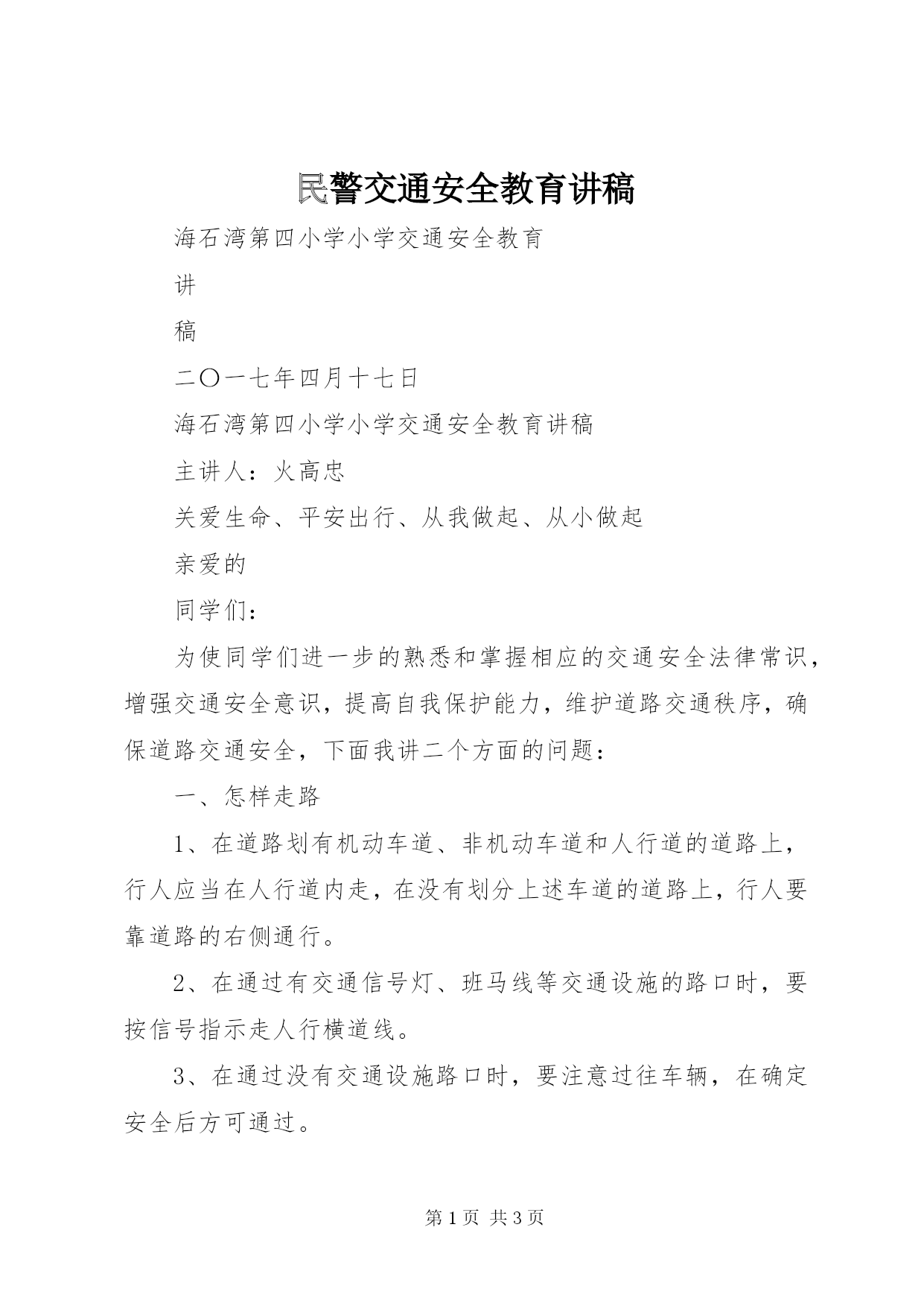 第PAGE\*Arabic\*MERGEFORMAT3页共NUMPAGES\*MERGEFORMAT3页民警交通安全教育讲稿海石湾第四小学小学交通安全教育讲稿二〇一七年四月十七日海石湾第四小学小学交通安全教育讲稿主讲人:火高忠关爱生命、平安出行、从我做起、从小做起亲爱的同学们:为使同学们进一步的熟悉和掌握相应的交通安全法律常识,增强交通安全意识,提高自我保护能力,维护道路交通秩序,确保道路交通安全,下面我讲二个方面的问题:一、怎样走路1、在道路划有机动车道、非机动车道和人行道的道路上,行人应当