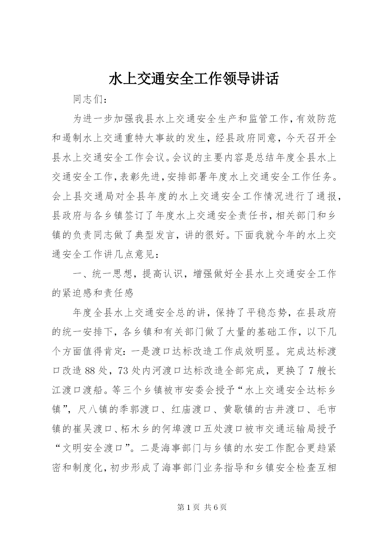 第PAGE\*Arabic\*MERGEFORMAT6页共NUMPAGES\*MERGEFORMAT6页水上交通安全工作领导讲话同志们:为进一步加强我县水上交通安全生产和监管工作,有效防范和遏制水上交通重特大事故的发生,经县政府同意,今天召开全县水上交通安全工作会议。会议的主要内容是总结年度全县水上交通安全工作,表彰先进,安排部署年度水上交通安全工作任务。会上县交通局对全县年度的水上交通安全工作情况进行了通报,县政府与各乡镇签订了年度水上交通安全责任书,相关部门和乡镇的负责同志做了典型发言,讲
