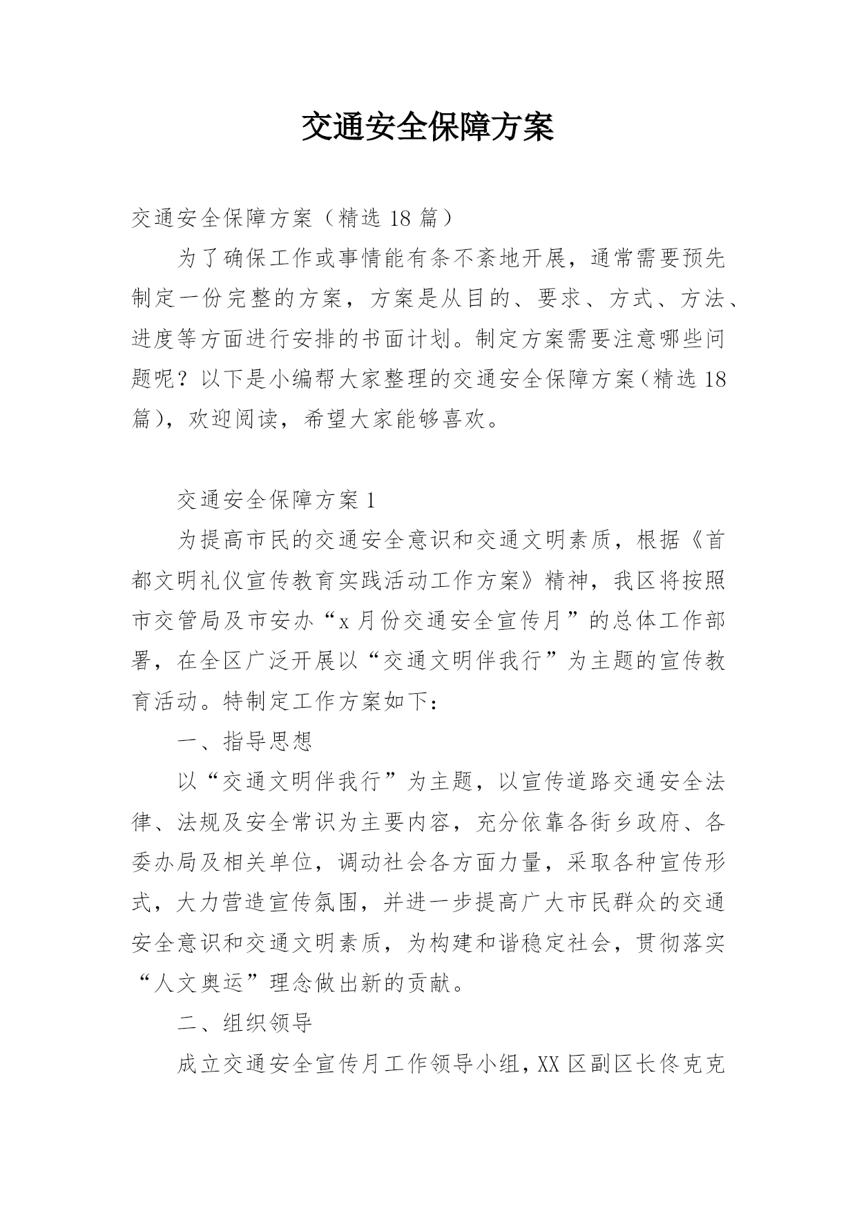 交通安全保障方案交通安全保障方案(精选18篇)为了确保工作或事情能有条不紊地开展,通常需要预先制定一份完整的方案,方案是从目的、要求、方式、方法、进度等方面进行安排的书面计划。制定方案需要注意哪些问题呢?以下是小编帮大家整理的交通安全保障方案(精选18篇),欢迎阅读,希望大家能够喜欢。交通安全保障方案1为提高市民的交通安全意识和交通文明素质,根据《首都文明礼仪宣传教育实践活动工作方案》精神,我区将按照市交管局及市安办“x月份交通安全宣传月”的总体工作部署,在全区广泛开展以“交通文明伴我行”为主题的宣传教育