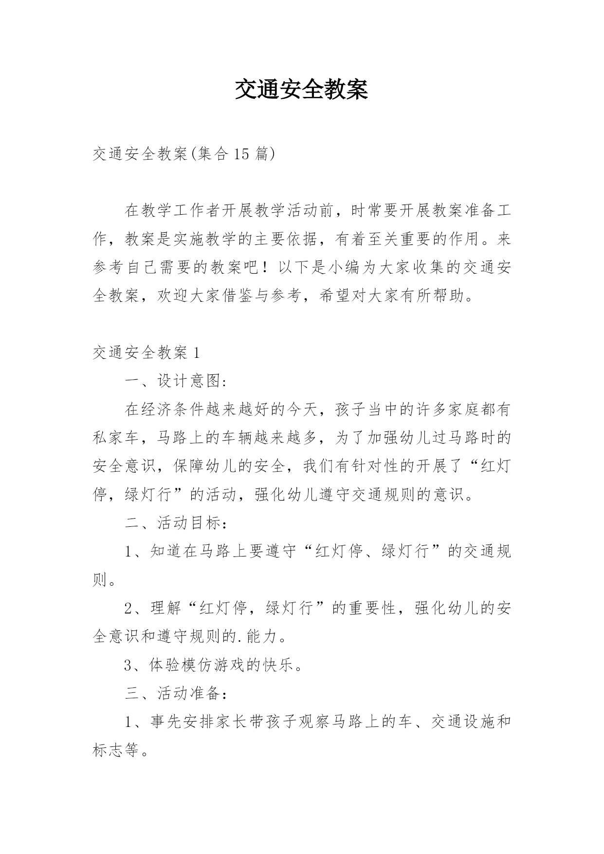 交通安全教案交通安全教案(集合15篇)在教学工作者开展教学活动前,时常要开展教案准备工作,教案是实施教学的主要依据,有着至关重要的作用。来参考自己需要的教案吧!以下是小编为大家收集的交通安全教案,欢迎大家借鉴与参考,希望对大家有所帮助。交通安全教案1一、设计意图:在经济条件越来越好的今天,孩子当中的许多家庭都有私家车,马路上的车辆越来越多,为了加强幼儿过马路时的安全意识,保障幼儿的安全,我们有针对性的开展了“红灯停,绿灯行”的活动,强化幼儿遵守交通规则的意识。二、活动目标:1、知道在马路上要遵守“红灯停、