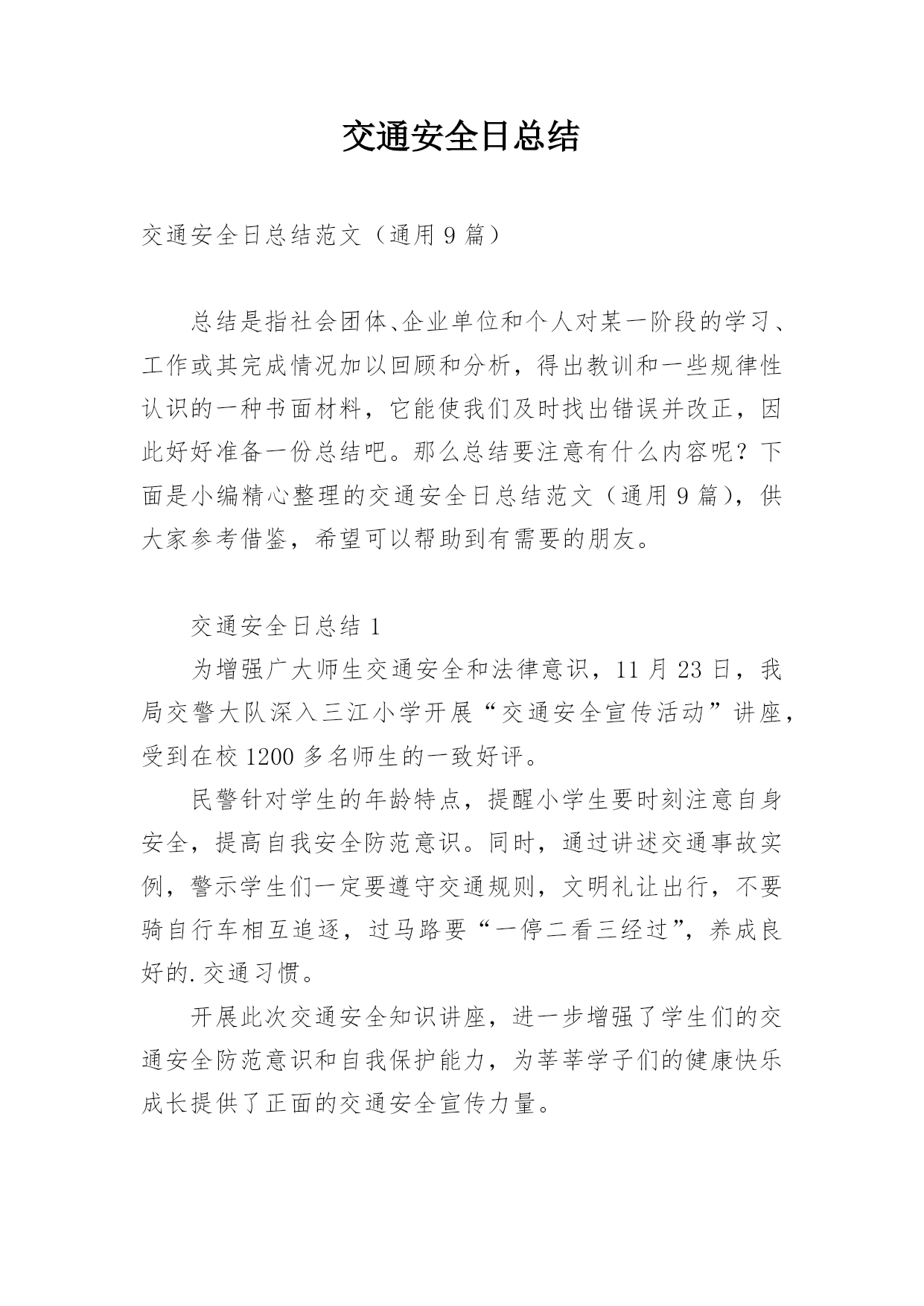 交通安全日总结交通安全日总结范文(通用9篇)总结是指社会团体、企业单位和个人对某一阶段的学习、工作或其完成情况加以回顾和分析,得出教训和一些规律性认识的一种书面材料,它能使我们及时找出错误并改正,因此好好准备一份总结吧。那么总结要注意有什么内容呢?下面是小编精心整理的交通安全日总结范文(通用9篇),供大家参考借鉴,希望可以帮助到有需要的朋友。交通安全日总结1为增强广大师生交通安全和法律意识,11月23日,我局交警大队深入三江小学开展“交通安全宣传活动”讲座,受到在校1200多名师生的一致好评。民警针对学生