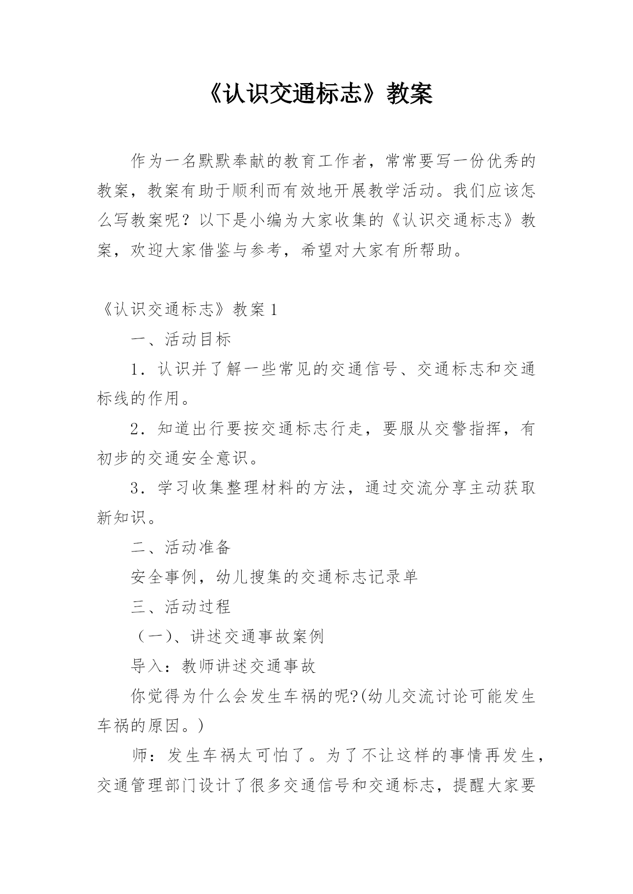 《认识交通标志》教案作为一名默默奉献的教育工作者,常常要写一份优秀的教案,教案有助于顺利而有效地开展教学活动。我们应该怎么写教案呢?以下是小编为大家收集的《认识交通标志》教案,欢迎大家借鉴与参考,希望对大家有所帮助。《认识交通标志》教案1一、活动目标1.认识并了解一些常见的交通信号、交通标志和交通标线的作用。2.知道出行要按交通标志行走,要服从交警指挥,有初步的交通安全意识。3.学习收集整理材料的方法,通过交流分享主动获取新知识。二、活动准备安全事例,幼儿搜集的交通标志记录单三、活动过程(一)、讲述交通事
