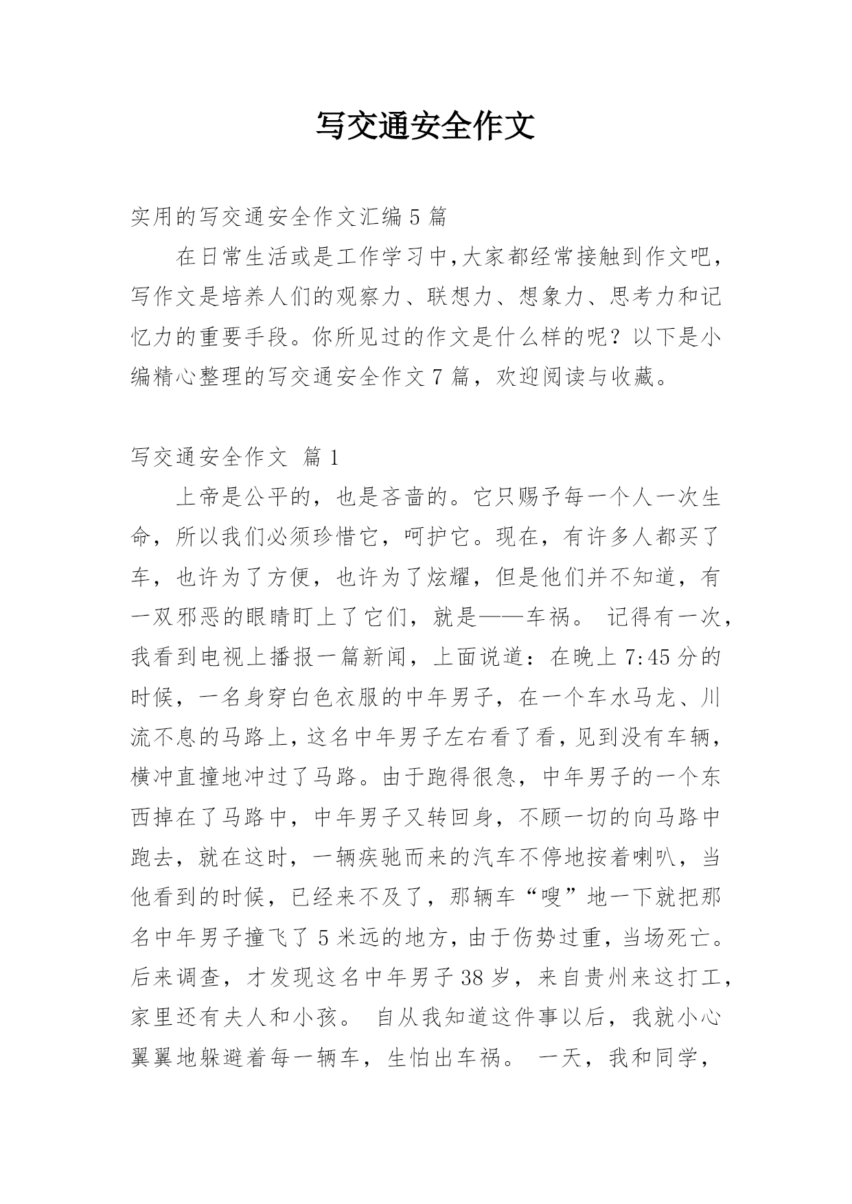 写交通安全作文实用的写交通安全作文汇编5篇在日常生活或是工作学习中,大家都经常接触到作文吧,写作文是培养人们的观察力、联想力、想象力、思考力和记忆力的重要手段。你所见过的作文是什么样的呢?以下是小编精心整理的写交通安全作文7篇,欢迎阅读与收藏。写交通安全作文篇1上帝是公平的,也是吝啬的。它只赐予每一个人一次生命,所以我们必须珍惜它,呵护它。现在,有许多人都买了车,也许为了方便,也许为了炫耀,但是他们并不知道,有一双邪恶的眼睛盯上了它们,就是——车祸。记得有一次,我看到电视上播报一篇新闻,上面说道:在晚上7