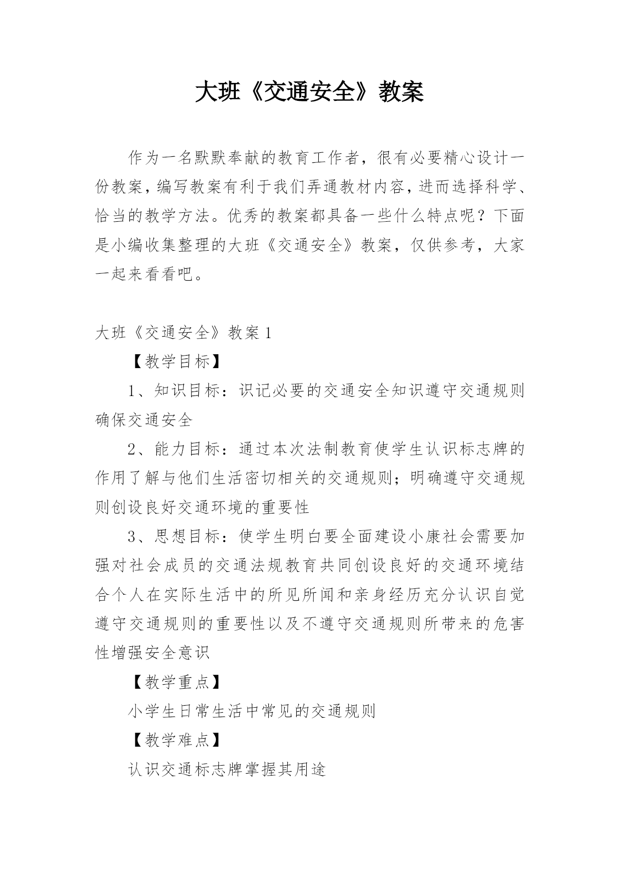 大班《交通安全》教案作为一名默默奉献的教育工作者,很有必要精心设计一份教案,编写教案有利于我们弄通教材内容,进而选择科学、恰当的教学方法。优秀的教案都具备一些什么特点呢?下面是小编收集整理的大班《交通安全》教案,仅供参考,大家一起来看看吧。大班《交通安全》教案1【教学目标】1、知识目标:识记必要的交通安全知识遵守交通规则确保交通安全2、能力目标:通过本次法制教育使学生认识标志牌的作用了解与他们生活密切相关的交通规则;明确遵守交通规则创设良好交通环境的重要性3、思想目标:使学生明白要全面建设小康社会需要加强