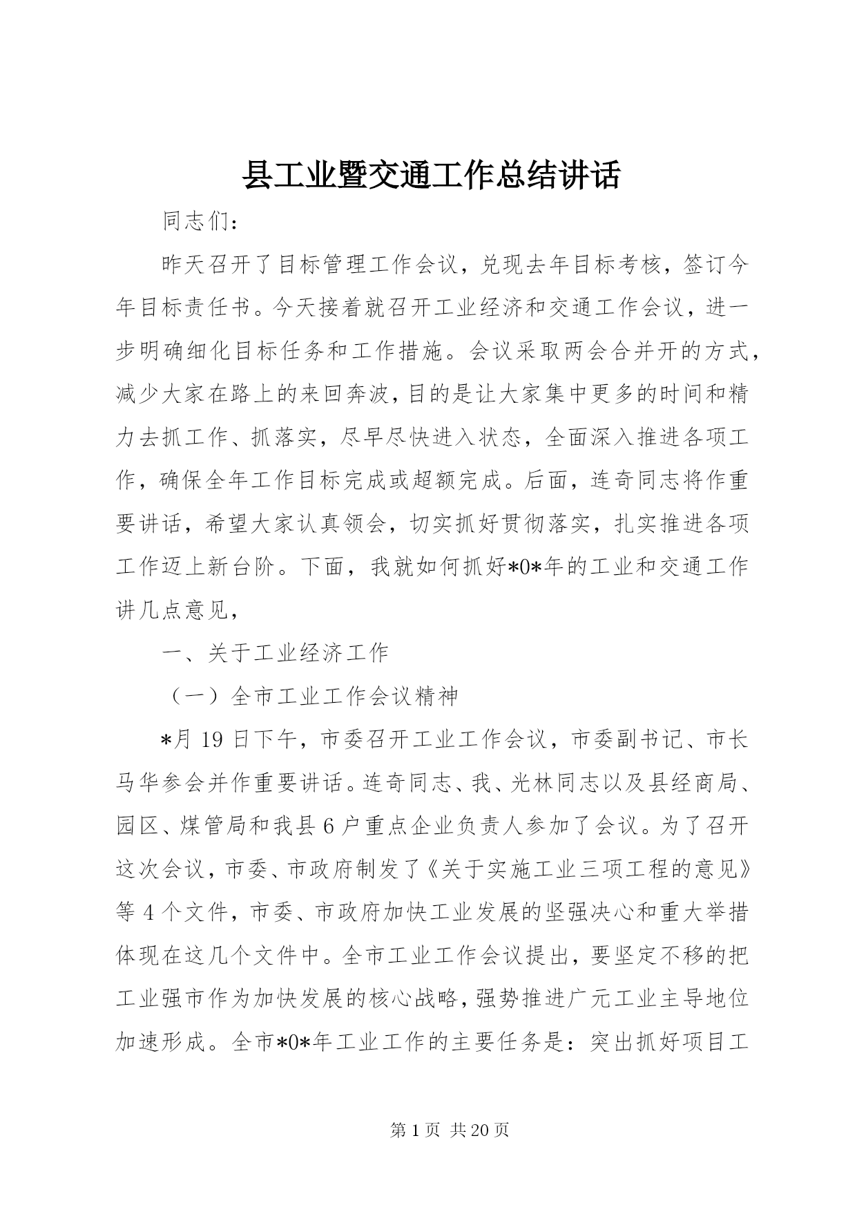 第PAGE\*Arabic\*MERGEFORMAT20页共NUMPAGES\*MERGEFORMAT20页县工业暨交通工作总结讲话同志们:昨天召开了目标管理工作会议,兑现去年目标考核,签订今年目标责任书。今天接着就召开工业经济和交通工作会议,进一步明确细化目标任务和工作措施。会议采取两会合并开的方式,减少大家在路上的来回奔波,目的是让大家集中更多的时间和精力去抓工作、抓落实,尽早尽快进入状态,全面深入推进各项工作,确保全年工作目标完成或超额完成。后面,连奇同志将作重要讲话,希望大家认真领会,