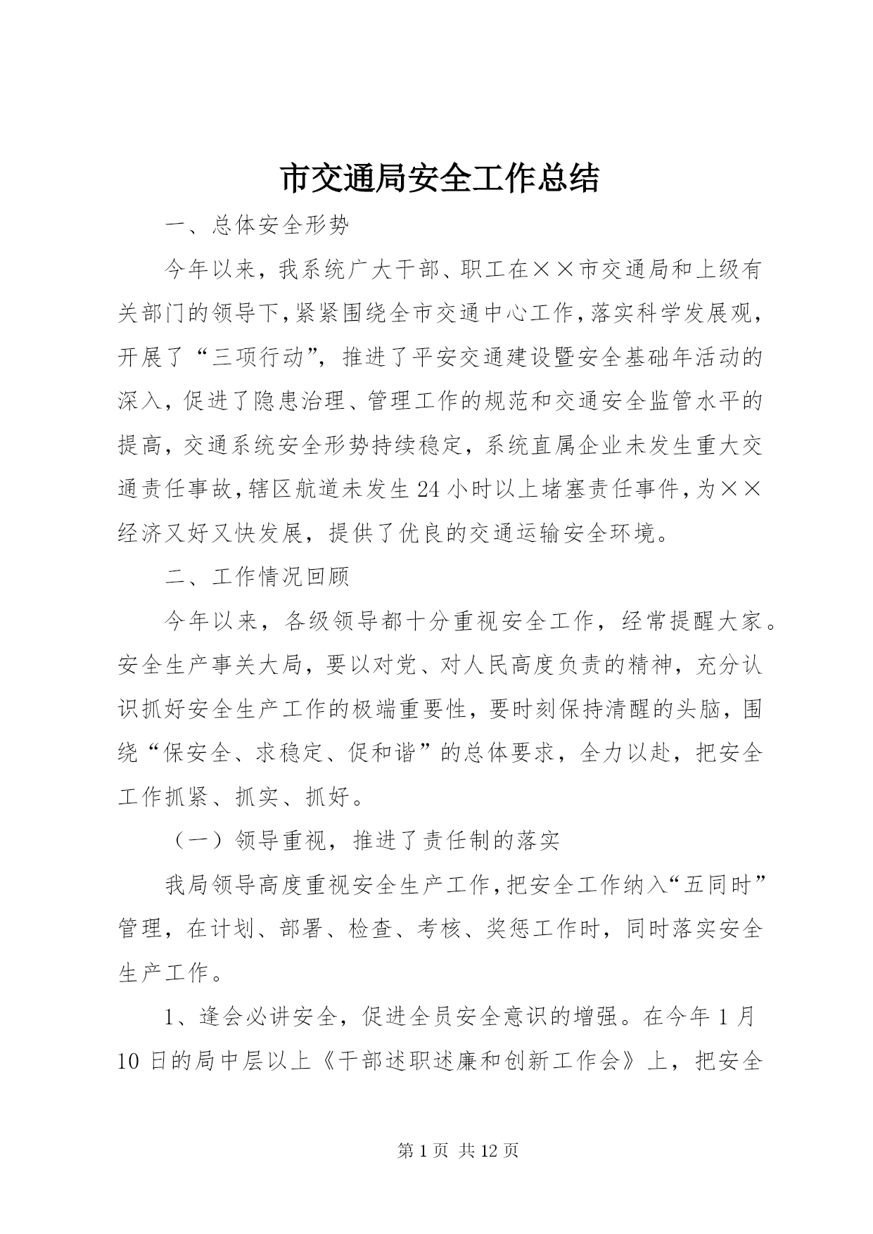 第PAGE\*Arabic\*MERGEFORMAT12页共NUMPAGES\*MERGEFORMAT12页市交通局安全工作总结一、总体安全形势今年以来,我系统广大干部、职工在××市交通局和上级有关部门的领导下,紧紧围绕全市交通中心工作,落实科学发展观,开展了“三项行动”,推进了平安交通建设暨安全基础年活动的深入,促进了隐患治理、管理工作的规范和交通安全监管水平的提高,交通系统安全形势持续稳定,系统直属企业未发生重大交通责任事故,辖区航道未发生24小时以上堵塞责任事件,为××经济又好又快发展,