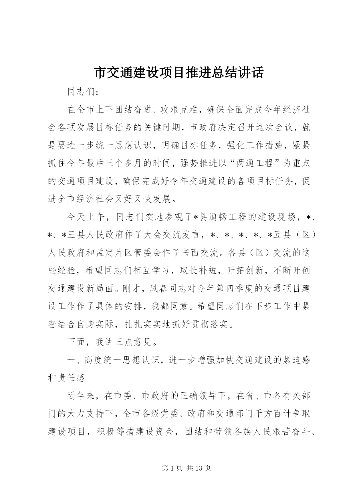 第PAGE\*Arabic\*MERGEFORMAT13页共NUMPAGES\*MERGEFORMAT13页市交通建设项目推进总结讲话同志们:在全市上下团结奋进、攻艰克难,确保全面完成今年经济社会各项发展目标任务的关键时期,市政府决定召开这次会议,就是要进一步统一思想认识,明确目标任务,强化工作措施,紧紧抓住今年最后三个多月的时间,强势推进以“两通工程”为重点的交通项目建设,确保完成好今年交通建设的各项目标任务,促进全市经济社会又好又快发展。今天上午,同志们实地参观了*县通畅工程的建设现场,*