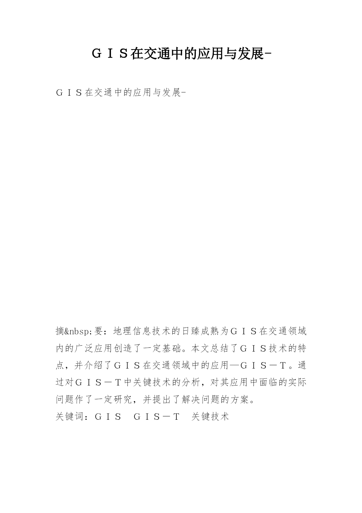 GIS在交通中的应用与发展-GIS在交通中的应用与发展-摘 要:地理信息技术的日臻成熟为GIS在交通领域内的广泛应用创造了一定基础。本文总结了GIS技术的特点,并介绍了GIS在交通领域中的应用—GIS-T。通过对GIS-T中关键技术的分析,对其应用中面临的实际问题作了一定研究,并提出了解决问题的方案。关键词:GISGIS-T关键技术解决方案地理信息系统是集现代计算机科学、地理学、信息科学、管理科学和测绘科学为一体的一门新兴学科。它采用数据库、计算机图形学、多媒体等最新技术,对地理信息进行数据处理