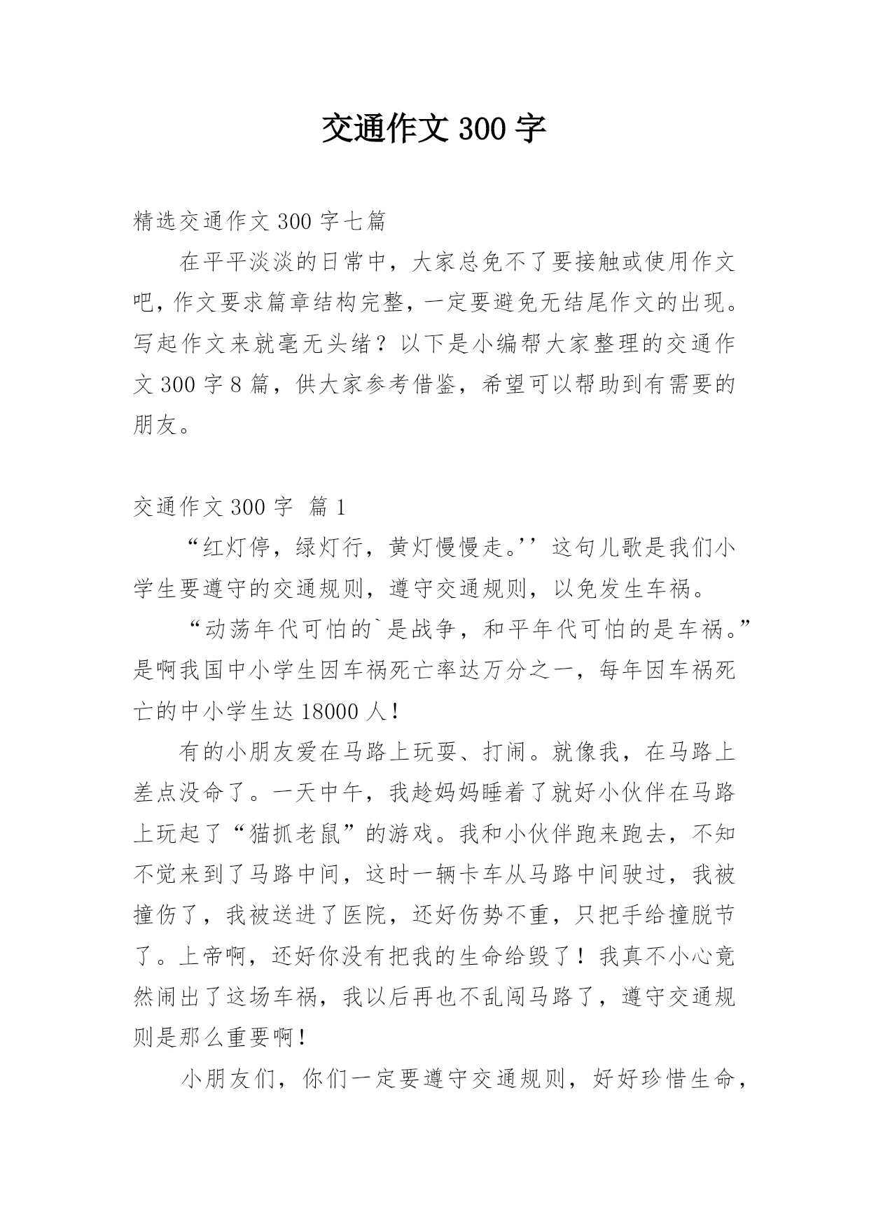 交通作文300字精选交通作文300字七篇在平平淡淡的日常中,大家总免不了要接触或使用作文吧,作文要求篇章结构完整,一定要避免无结尾作文的出现。写起作文来就毫无头绪?以下是小编帮大家整理的交通作文300字8篇,供大家参考借鉴,希望可以帮助到有需要的朋友。交通作文300字篇1“红灯停,绿灯行,黄灯慢慢走。’’这句儿歌是我们小学生要遵守的交通规则,遵守交通规则,以免发生车祸。“动荡年代可怕的`是战争,和平年代可怕的是车祸。”是啊我国中小学生因车祸死亡率达万分之一,每年因车祸死亡的中小学生达18000人!有的小朋