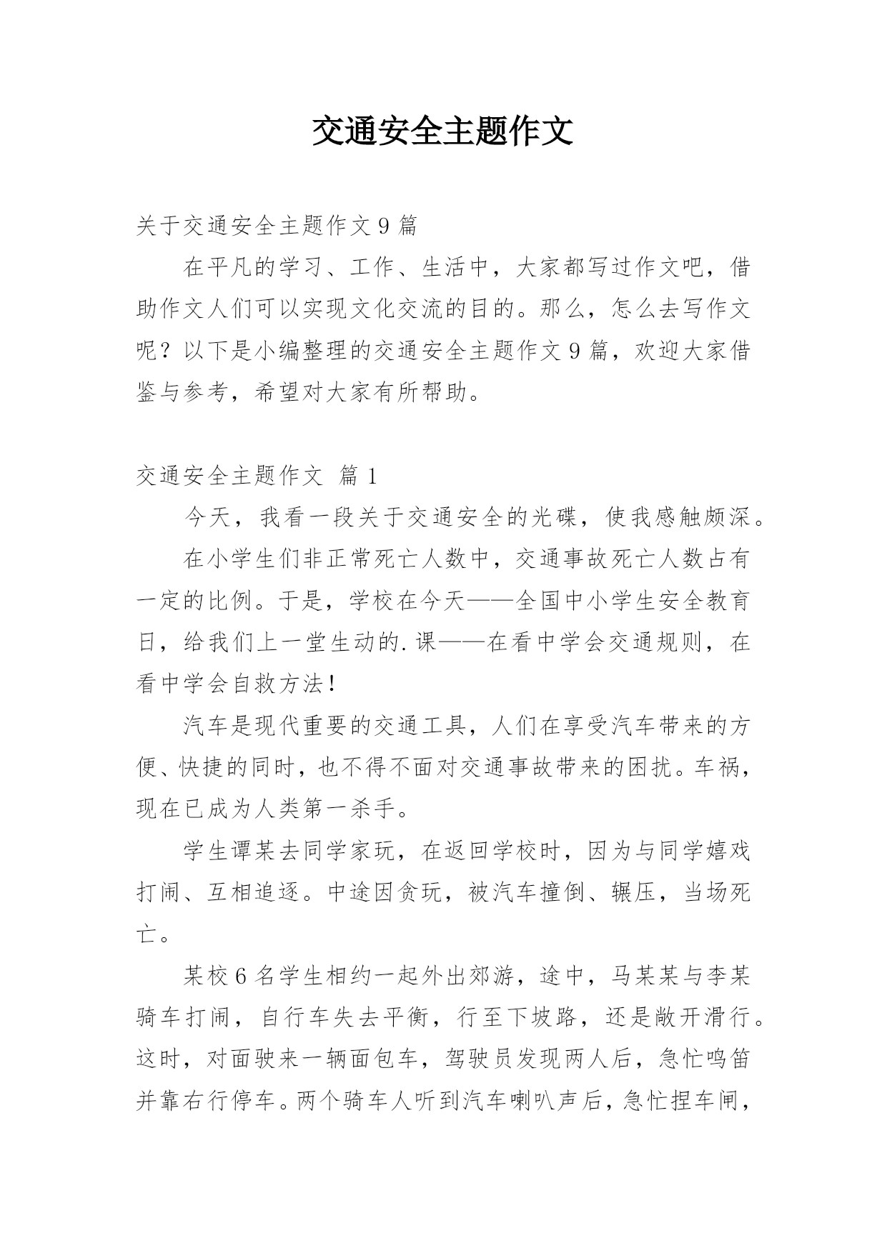 交通安全主题作文关于交通安全主题作文9篇在平凡的学习、工作、生活中,大家都写过作文吧,借助作文人们可以实现文化交流的目的。那么,怎么去写作文呢?以下是小编整理的交通安全主题作文9篇,欢迎大家借鉴与参考,希望对大家有所帮助。交通安全主题作文篇1今天,我看一段关于交通安全的光碟,使我感触颇深。在小学生们非正常死亡人数中,交通事故死亡人数占有一定的比例。于是,学校在今天——全国中小学生安全教育日,给我们上一堂生动的.课——在看中学会交通规则,在看中学会自救方法!汽车是现代重要的交通工具,人们在享受汽车带来的方便